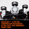 What sets Unimac apart from the rest is the huge triple 90mm Uni-GlideTM coated sleeves in a Tri-V layout with twin belt drive. When you are working on a project, you have to consider the moisture and air temperature which affects the performance of your air compressor and quality of air delivered. Unimac's patented Tri-V Triple piston with Uni-Glide™ Coated Sleeves is designed to have larger pistons operating at a much lower speed, which means lower rotations per minute directly result in lower operating temperatures. Larger pistons with lower temperature come with lesser moisture, not only prolonging the life of your air compressor, but also your valuable air tools - this is also super critical for spray painting applications for that perfect paint finish every time.