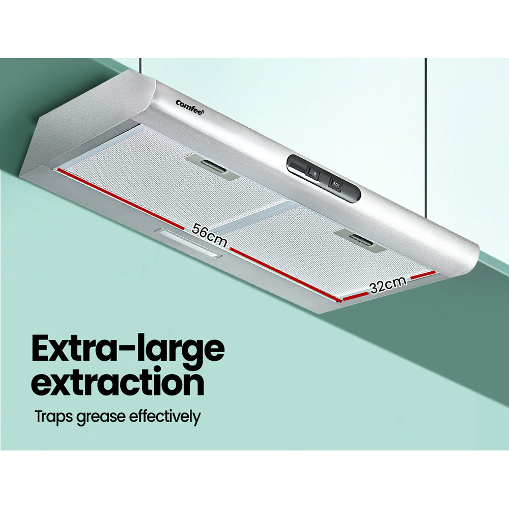 Thick smoke and steam from your cooking. Stifling odours all around. And your range hood is not doing its work to clear the mess. Not anymore with Comfee 600mm Range Hood. Featuring a powerful extraction rate of 300m³/hr from a high performance 100W rated motor, our stainless-steel range hood will clear the air of smoke, steam, odours and vapours in no time at all. The non-stick and removable 5-layer aluminium grease filter ensures all grease is efficiently captured. Completing the job is a 2-speed fan that can be easily selected with the rocker button switches. Clear and bright LED lights also provide vivid illumination for your cooking area, so you can see everything you're cooking.