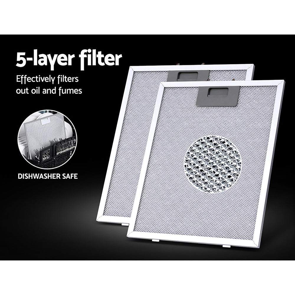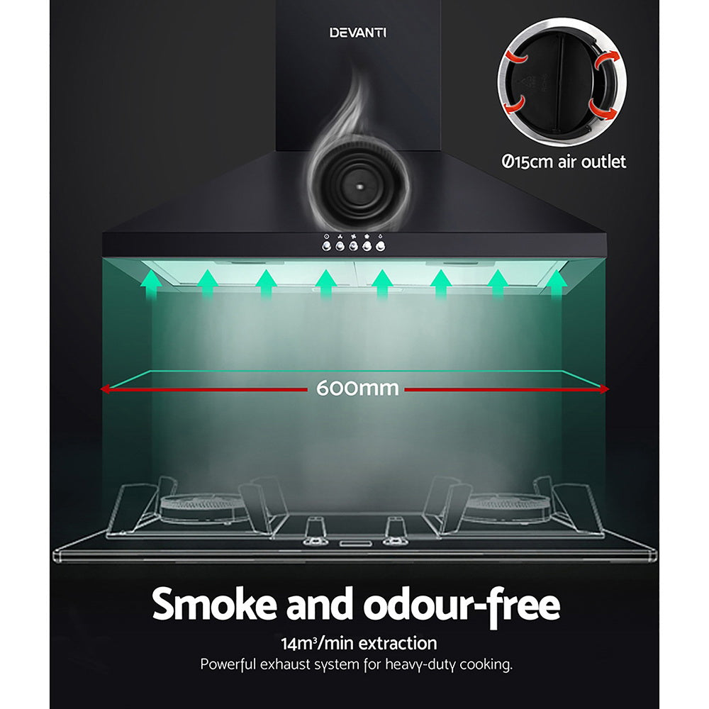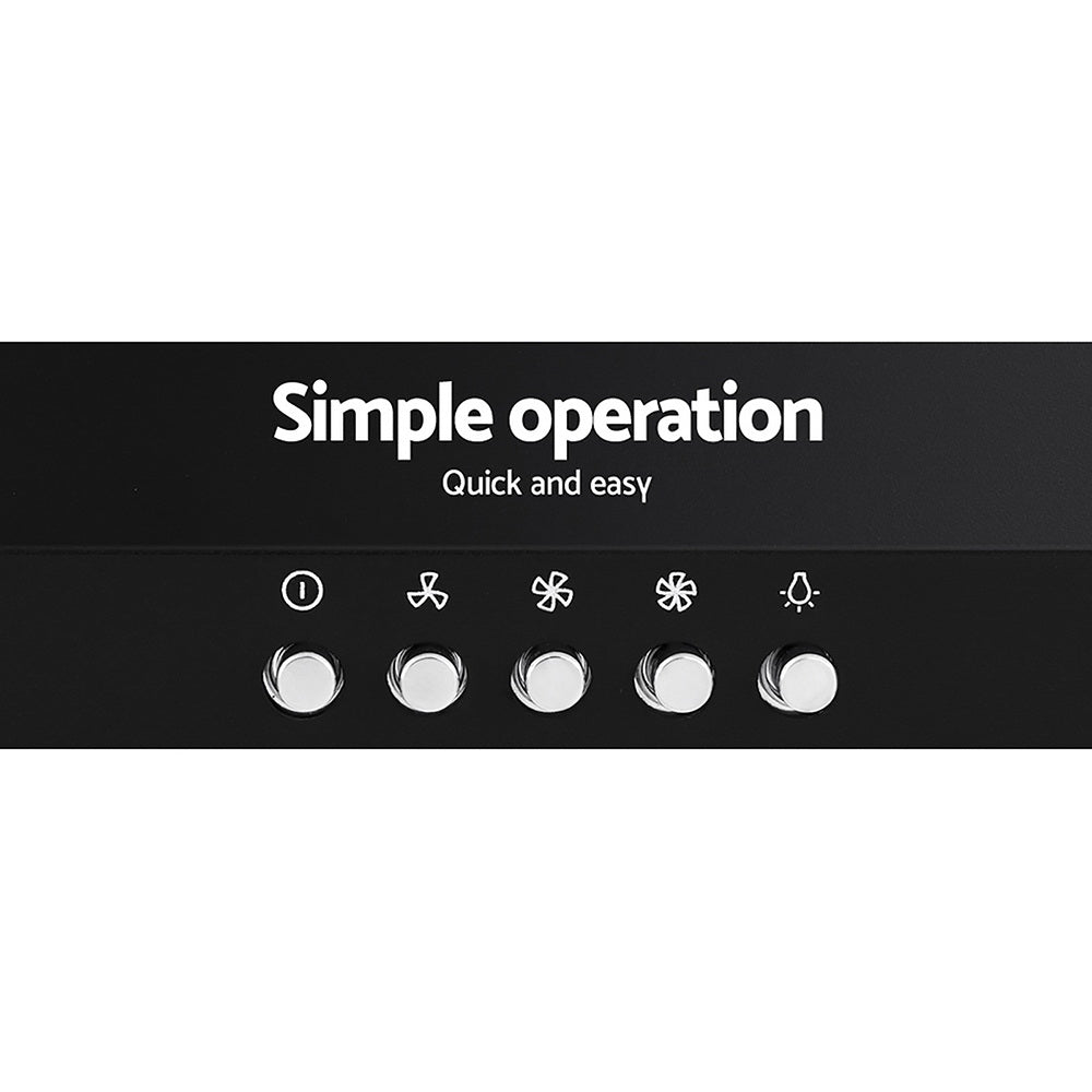 Say goodbye to smoky fumes and unwelcomed cooking odours with the Devanti Range Hood. With its high-performance motors, the black powder-coated steel range hood provides a steady upflow and filtered extraction of fumes and oil to keep your cooktop area clean and fresh after every use. With its 3-speed rocker button switches, the extraction speed can be adjusted to suit the circumstances. Other features include two non-stick 5-layer aluminium filters that are removable and replaceable and two bright 3W LED lamps to facilitate your illuminated cooking. The range hood is wall mounted and the chimney can be adjusted to fit the installation space.