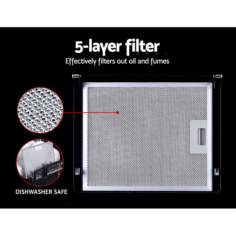 The Devanti Angled Range Hood is anything but mundane. With its unique side-draft wall-mounted design, the 30 degrees-inclined range hood helps to solve a perennial problem with traditional range hoods. No more getting your head in the way of your cooking and a better view of your cooking too. And you can also say goodbye to smoky fumes and unwelcomed cooking odours too. With its high-performance motor, the black tempered glass finish range hood provides a steady upflow and filtered extraction of fumes and oil to keep your cooktop area clean and fresh after every use. With its 3-speed touch controls, the extraction speed can be adjusted to suit the circumstances. Other features include two non-stick 5-layer aluminium filters that are removable and replaceable and two bright LED lamps to facilitate your Not least, it is also totally energy-efficient with plenty of cost savings for you.