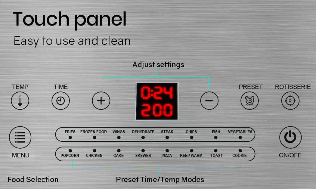 Why is the EuroChef 16L Air Fryer Rotisserie the ideal appliance? Precisely engineered heat sensors calibrate exact heat required for each of the 16 pre-set cooking options, and maintain consistent, even temperature for perfect tenderness. The EuroChef also boasts a cavernous size that allows you to cook on 3 trays simultaneously! Plus, with high powered cooking power and rapid air circulation you’ll be sure to enjoy delicious evenly cooked food in times that you previously wouldn’t have imagined possible. And, with a rotisserie you’ll serve up entire chickens that are succulent throughout and crispy on all sides!