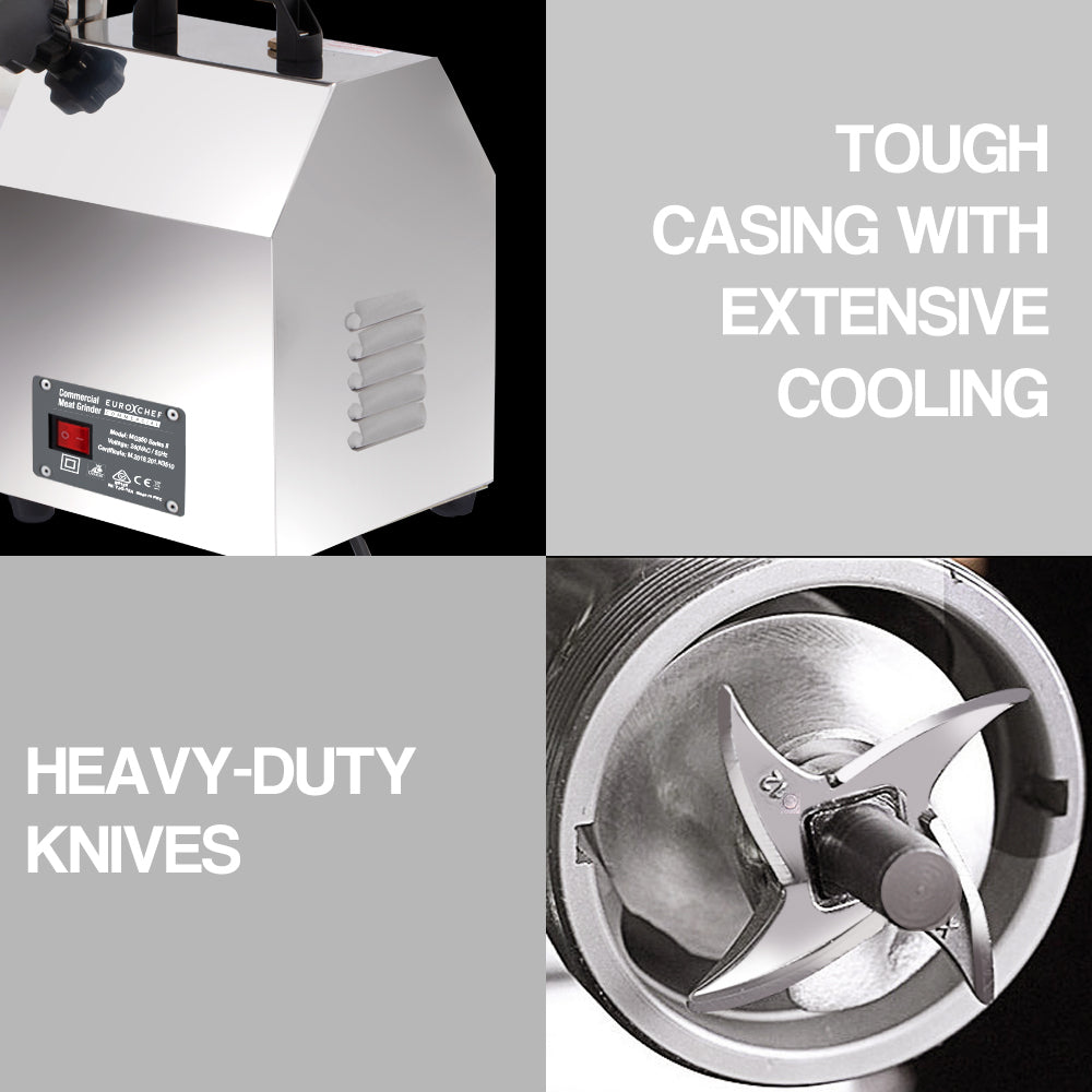 EuroChef Meat Grinders are noted for their exceptional reliability and the EuroChef Commercial offerings provide the heavy duty expected in business. The MG950 Series II has a genuine class-leading copper core 1.2 horsepower motor that is capable of grinding 150kg of meat each hour, day-in day-out.