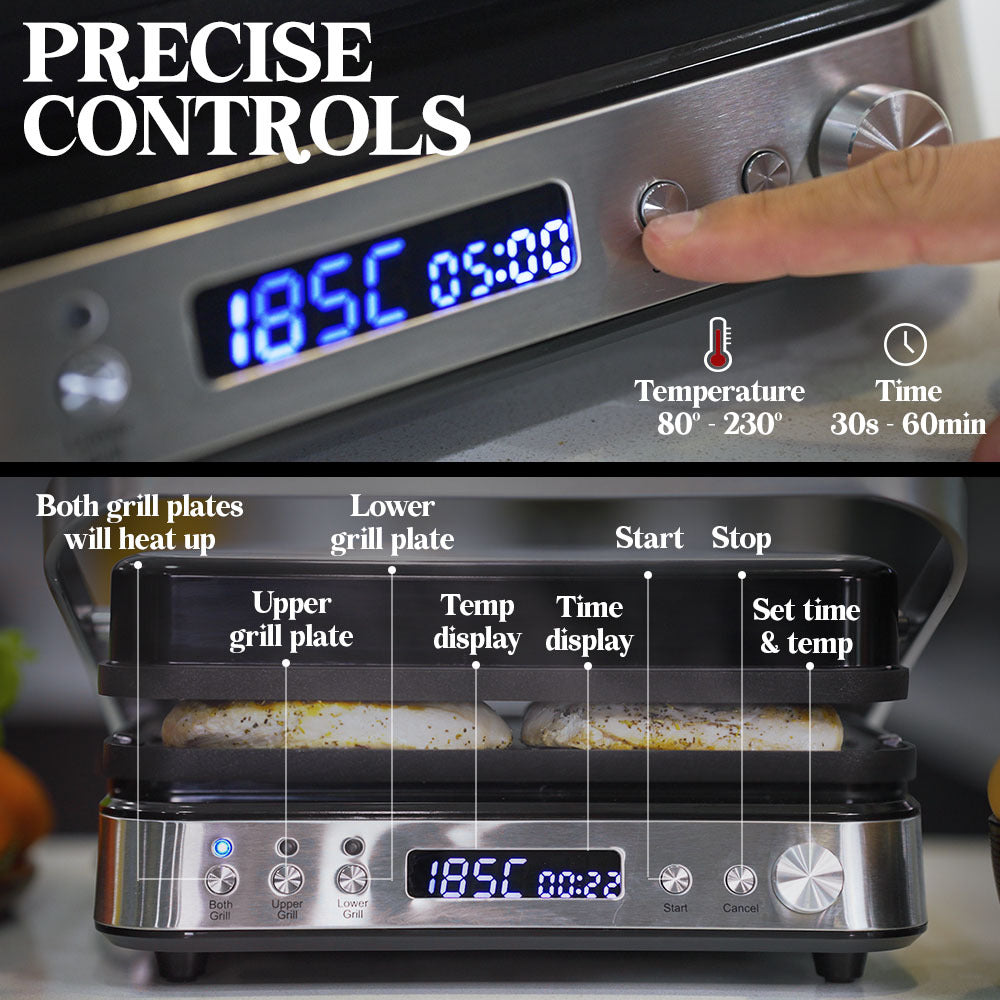 The easy to use control panel allows you to set the temperature for perfect cooking control and it will indicate when it is ready. Each plate of this powerful appliance quickly heats up to 230℃ so you can sizzle a succulent steak in no time. Thanks to the timer function you don’t have to worry about getting distracted and ending up with overcooked meals.