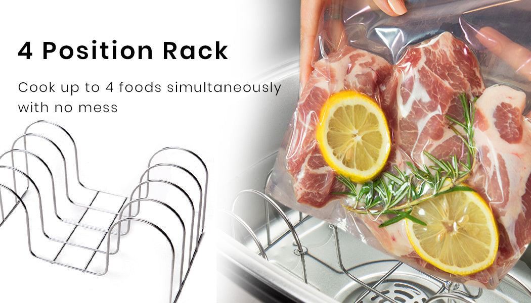 The included rack enables you to evenly cook 4 large steaks, or even prepare different types of food with no mess or cross-contamination. And, when you’re done you can pull them all out with the supplied tongs. With its sleek stainless steel appearance, the EuroChef will look right at home in any kitchen. Bring your Master Chef A-game to your next dinner party with the EuroChef Sous Vide Machine!