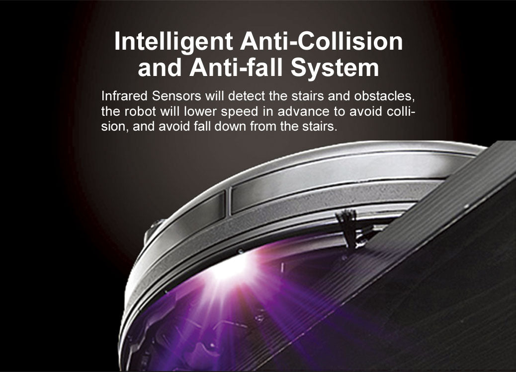 Intelligent anti-collision and anti-fall system - the infrared sensors detects and avoids areas such as stairs and obstacles which may interrupt its cleaning