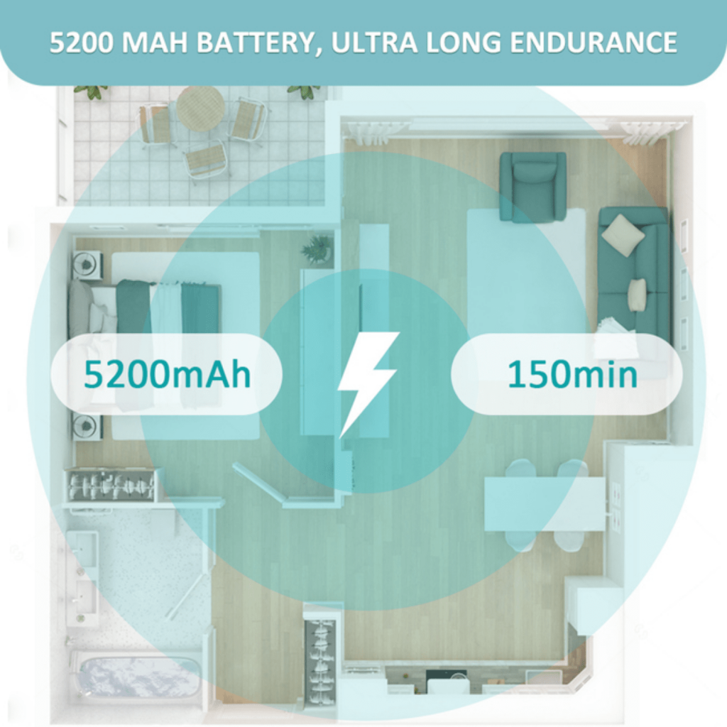 5200 mAh power capacity ensures more endurance of this robot vacuum cleaner compared to other comparable vacuum robots. 150 minutes. in the "quiet" level; full 120 minutes. in normal mode and a full 80 minutes. in maximum power mode.