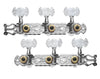 Machine heads for classical acoustic guitars with smooth tuning and removable knobs. Features an open-gear design, an elegant embossed nickel plates and lyre-ends and lustrous pearloid butterfly style tuners. Suitable for nylon-string guitars with slotted pegheads.