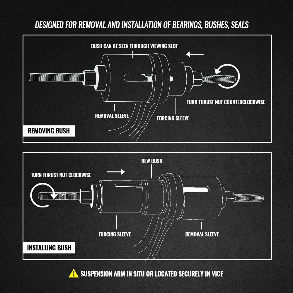 - Designed for the removal and installation of all types of bearings, bushes and seals. It is designed to remove and install bearings including silent bearings, hydraulic bearings, bearing bushes, ball bearings, shaft seals, rubber bearings and many more.