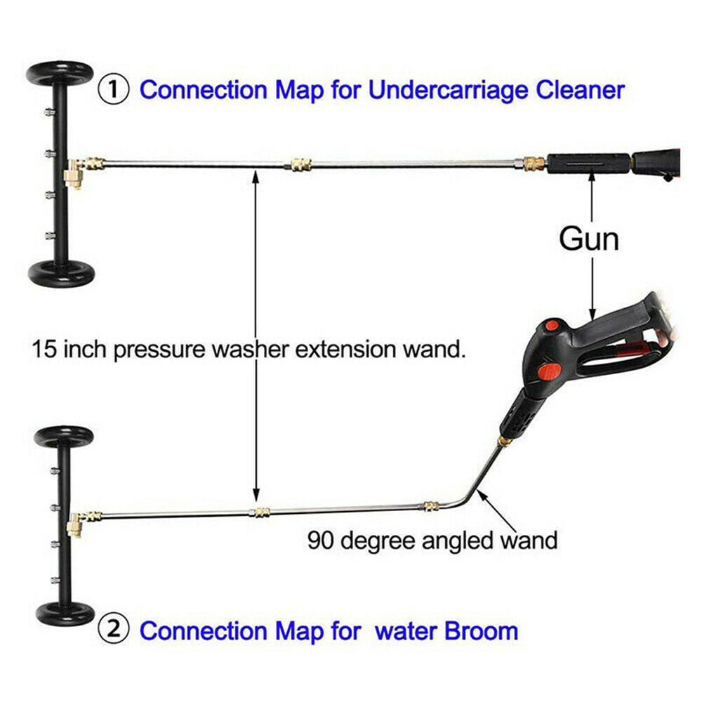 UNDERCARRIAGE CLEANER: Connect the elbow wand to the undercar cleaner, then connect the straight wand to the curved wand, then connect them to the pressure washer gun, control the washer gun to push the cleaner into the bottom of the car for cleaning. Suitable for all private cars and commercial vehicles. Perfect for cleaning the remaining mud, oil and fuel pollutants on the vehicle chassis.