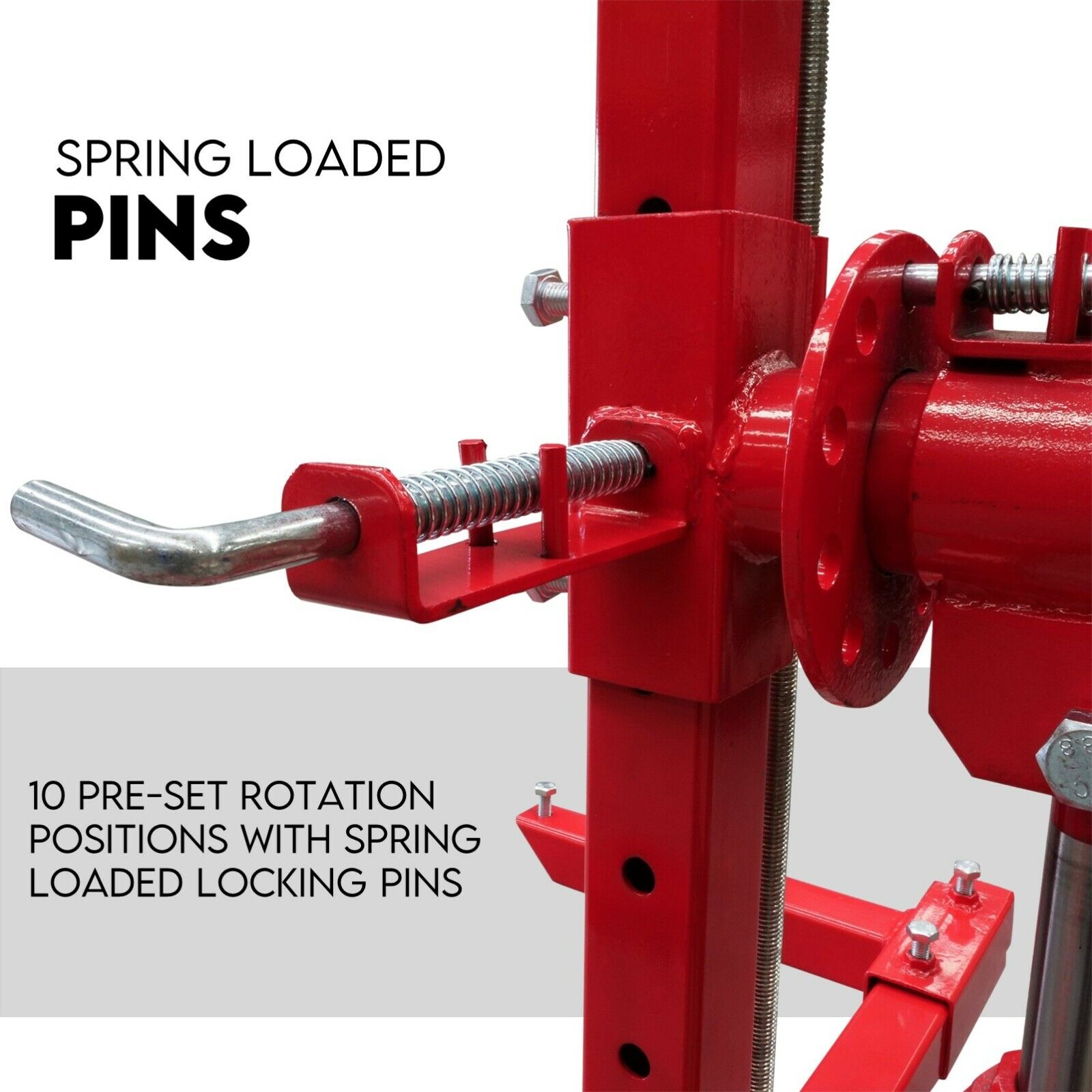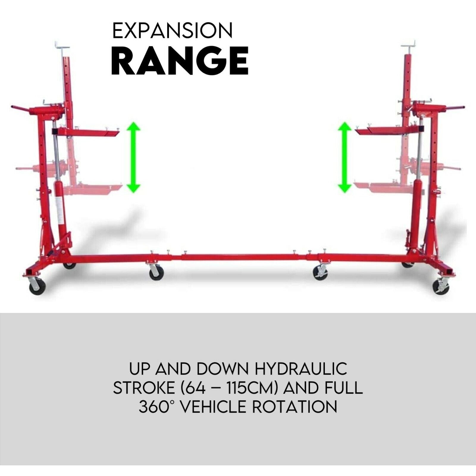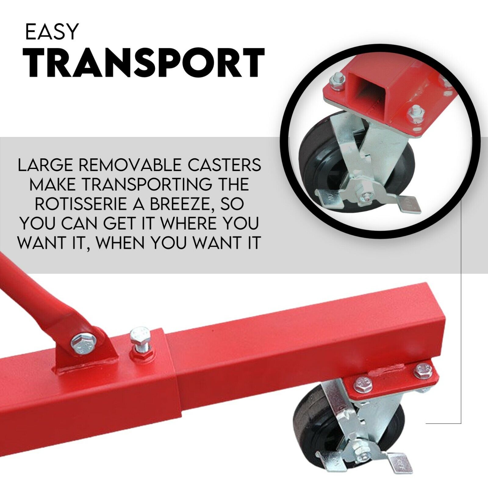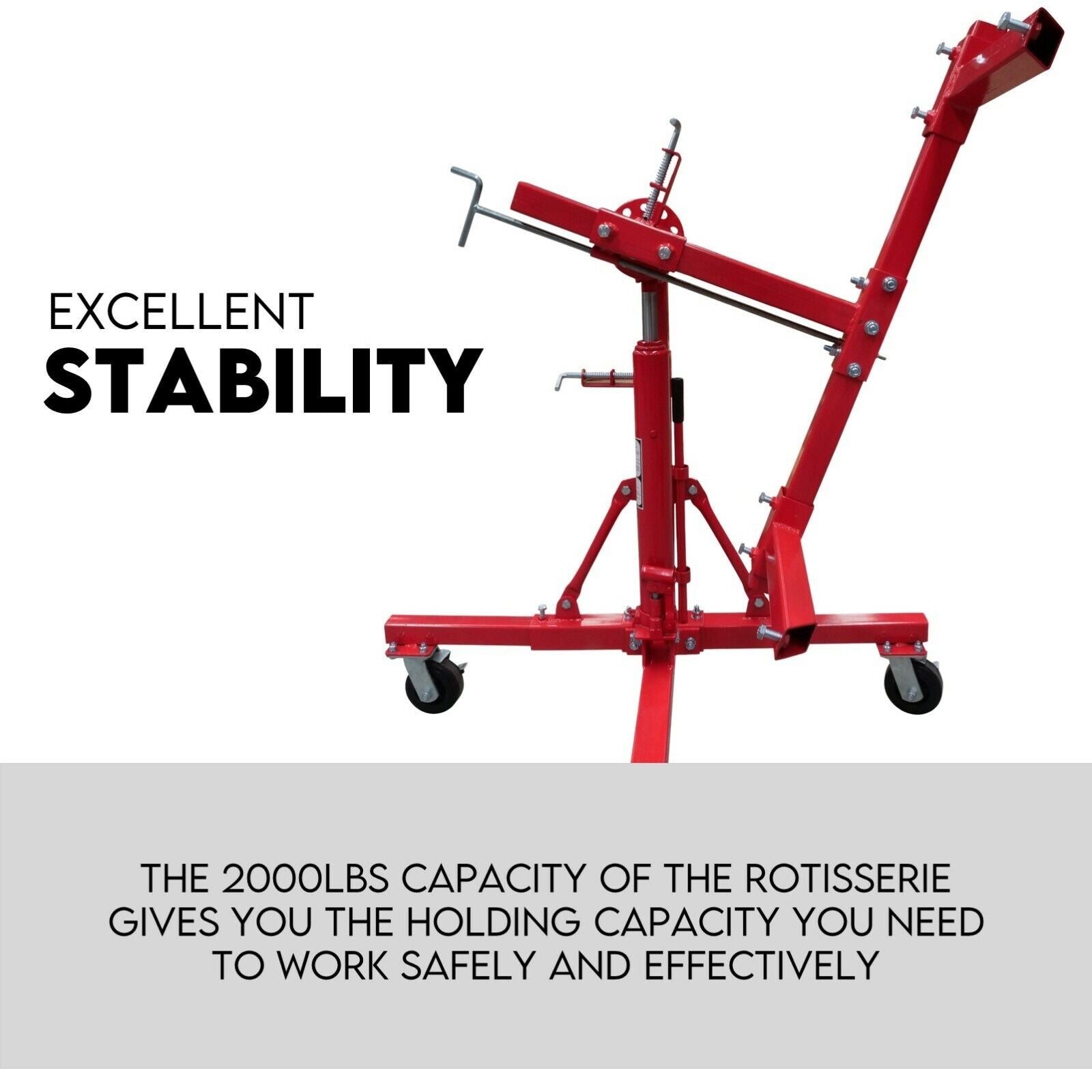 This 2000 lb. capacity rotisserie is a cost-effective solution that keeps your work smart. It features dual hydraulic cylinders that lift the lifting framework to the desired working height for those unreachable areas. In addition, it has a resistant powder coat finish to prevent rust and four locking casters from keeping your rotisserie stable while you work.