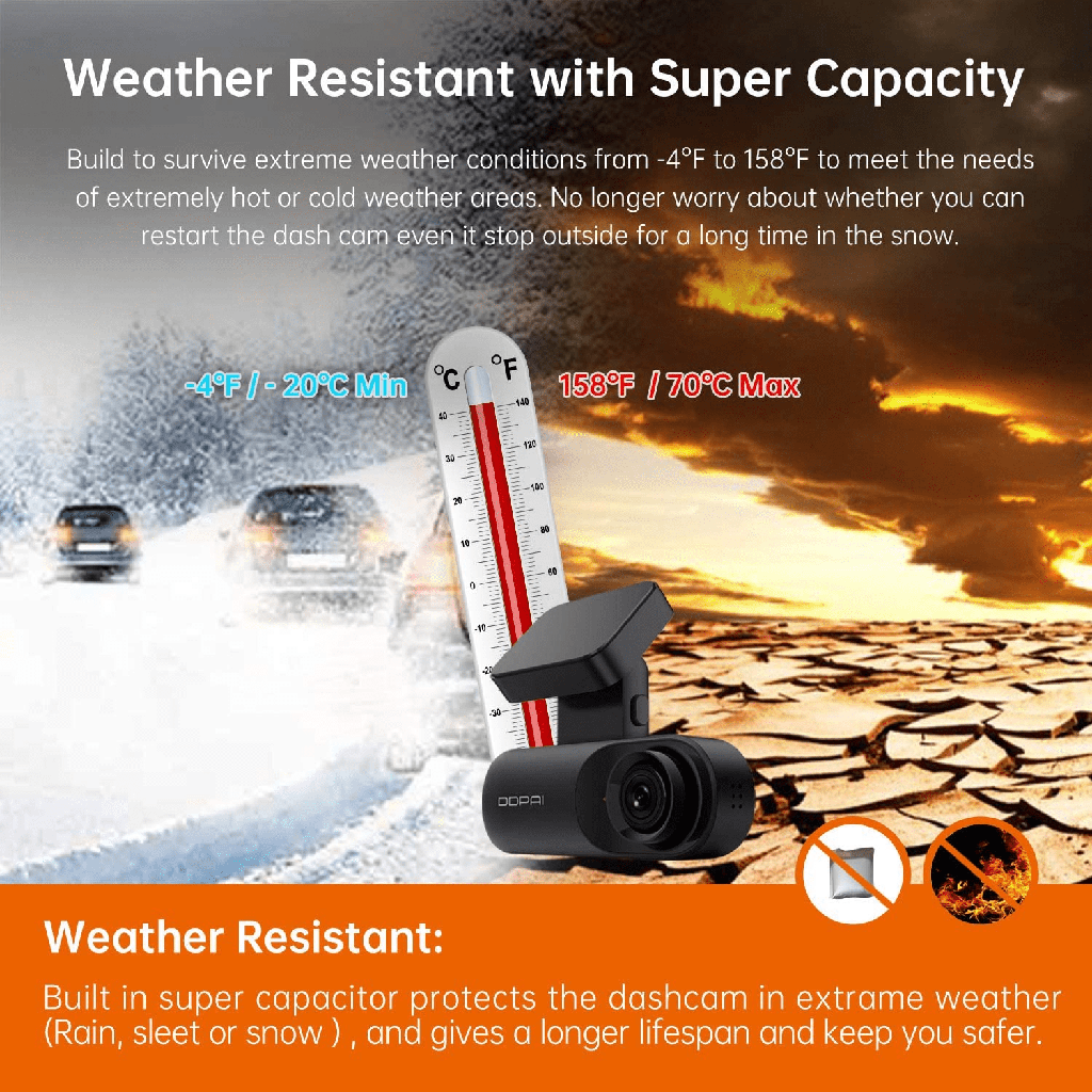 The Mola N3 dash cam is super capacitor powered instead of lithium batteries. Build to survive extreme weather conditions from -4°F to 158°F to meet the needs of extremely hot like Arizona, Florida or extremely cold areas Montana, Alaska. No longer worry about whether you can restart the dash cam even it stop outside for a long time in the snow. And it also gives a longer life-span than lithium-ion battery dash cams.
