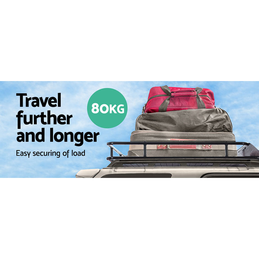 Travel further and longer with the Giantz Roof Luggage Rack. By adding more load carrying space and capacity to your vehicle, the rack enables you to take off for those distant road trips without minimum hassle. Made of high-quality powder-coated steel, the rack is strong and durable and also weatherproof. It has a weight capacity of up to 80kg. The mesh base also allows you to tie down your loads easily and firmly. Better still, the wind deflector helps to cut down wind resistance, thus saving you on fuel costs too. With its universal design, the roof rack will fit with most vehicles. Included with your purchase are all the assembly hardware with no tools needed for an easy set-up.