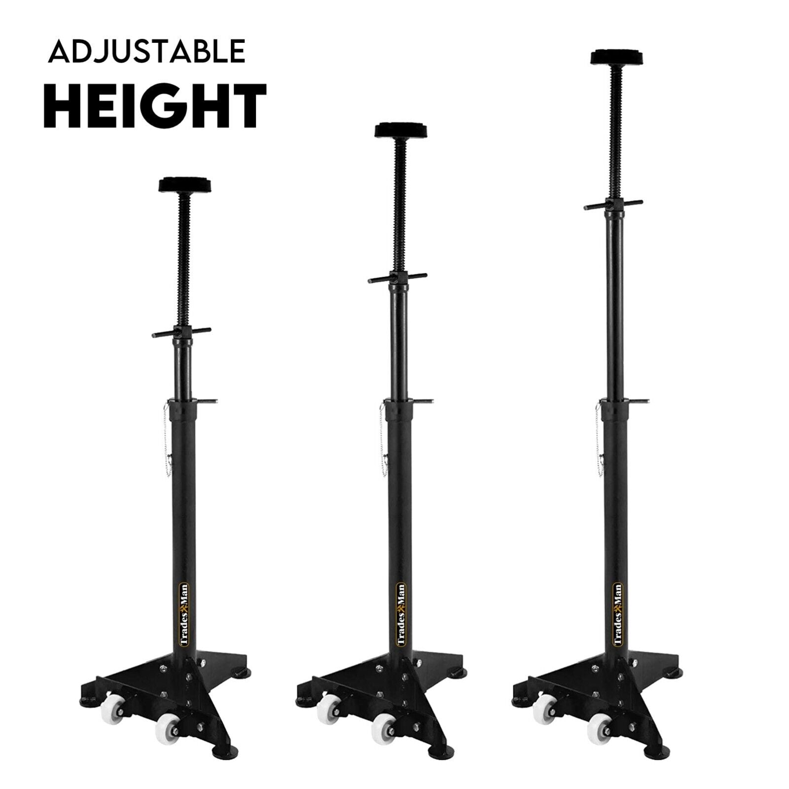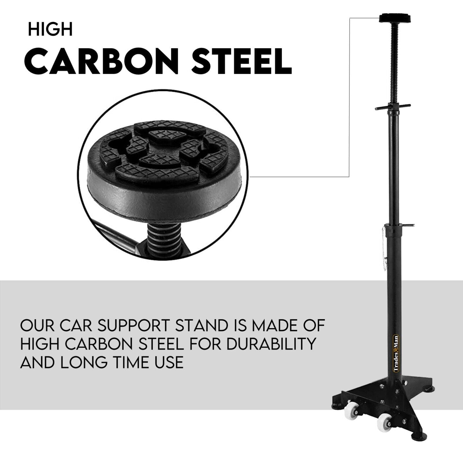 The tripod jack stand's height can be adjusted by holes in the column, and the spin handle. It also comes with two nylon wheels for its great portability and convenience.