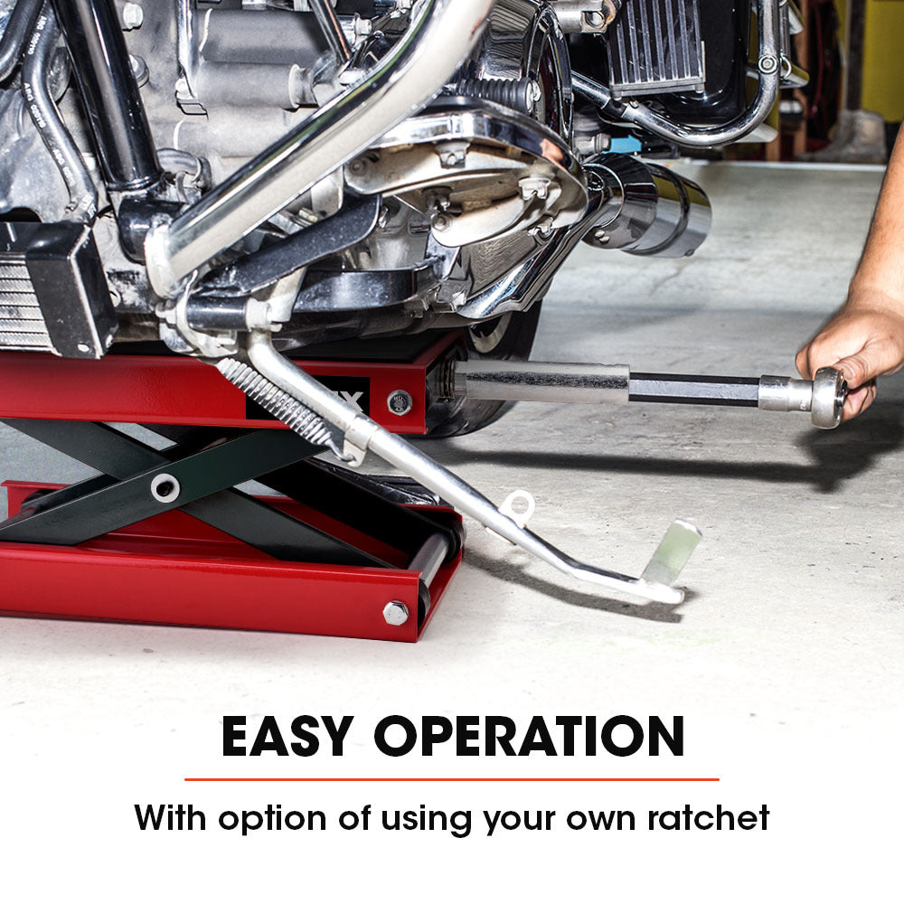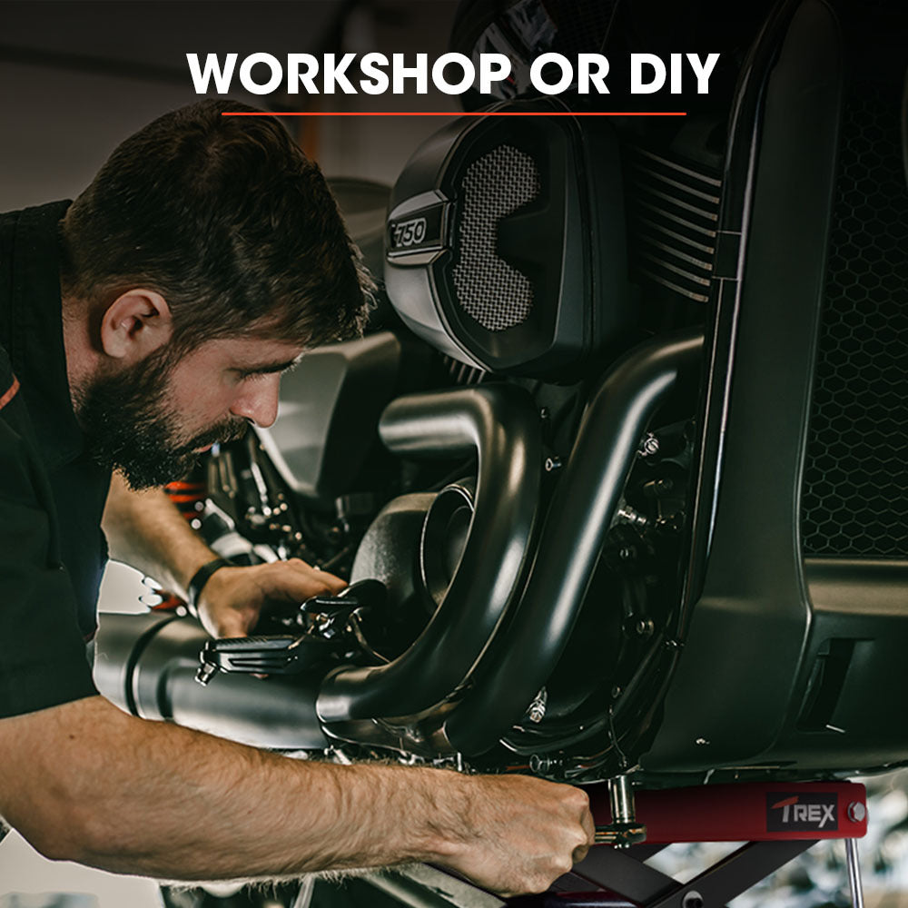 The T-Rex™ Motorcycle Scissor Jack is a heavy-duty professional-quality galvanised steel unit, with a huge 500kg lift-capacity that enables it to lift most motorcycles and quad bikes.