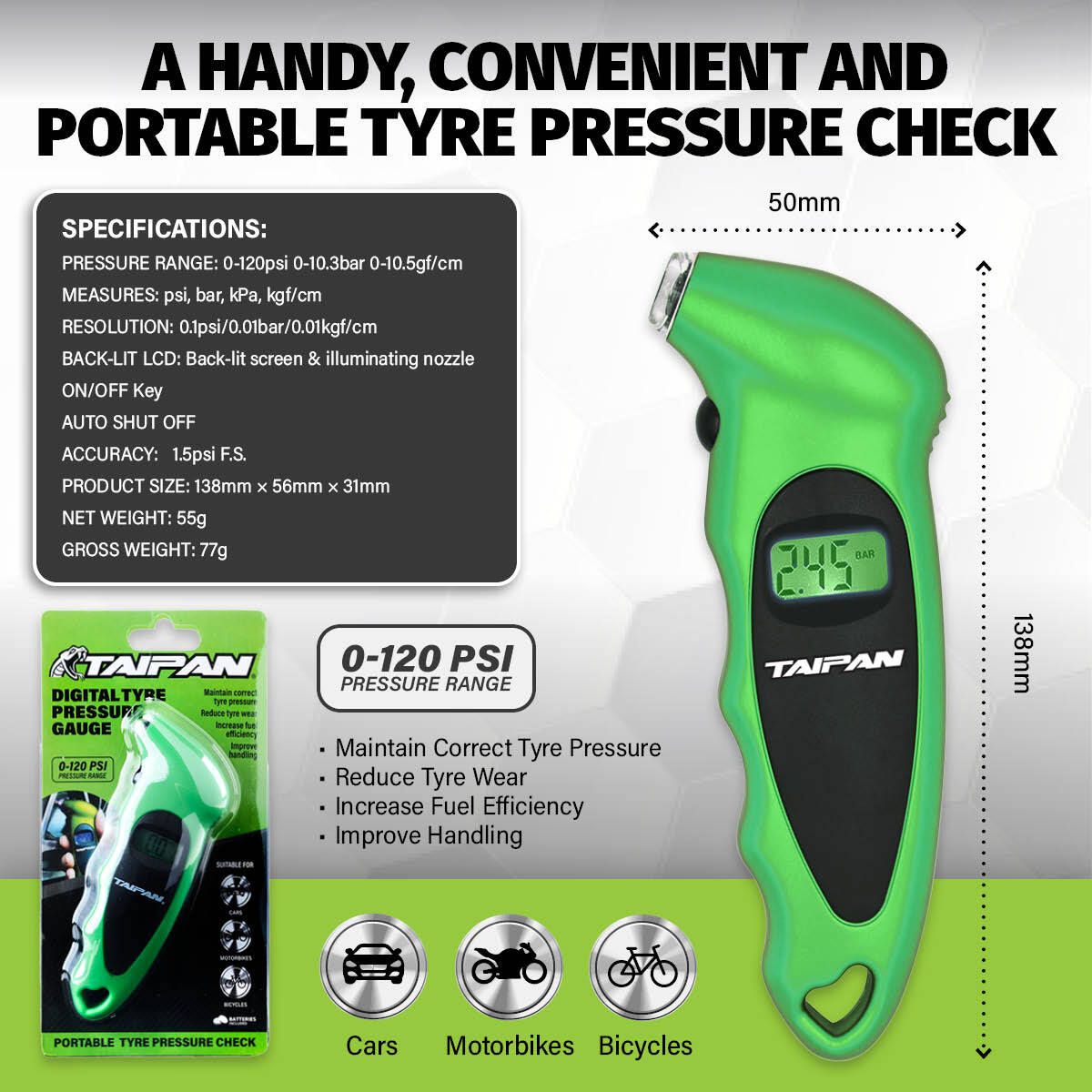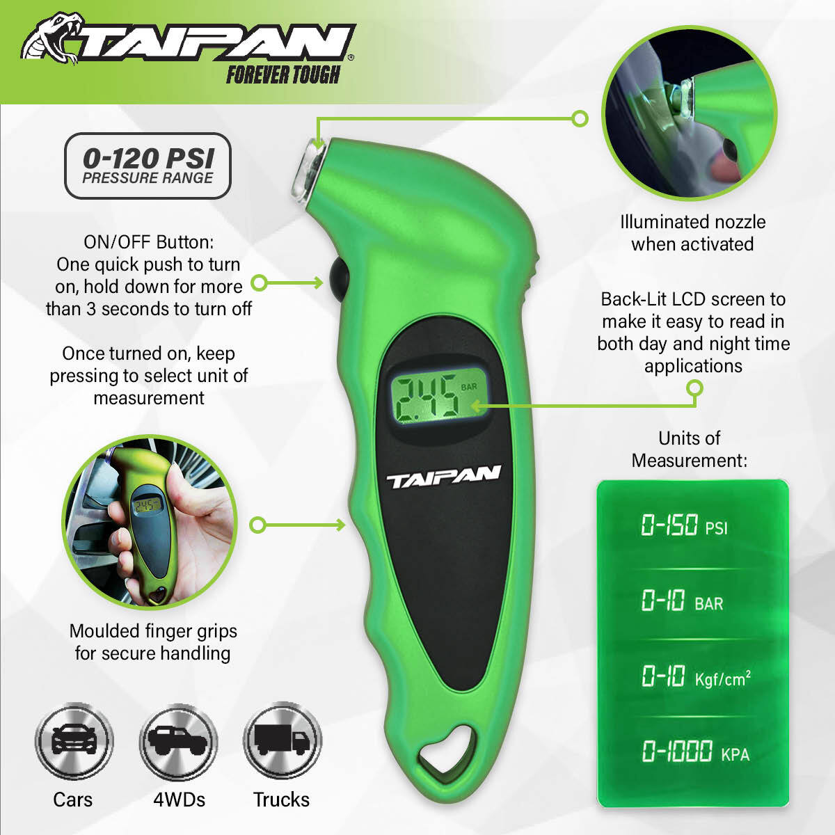 Taipan A portable and handy digital tyre pressure gauge to keep track of your vehicles tyre pressures. User-friendly, this tool has multiple display functions and back-lit LCD screen to read in both day and night time applications. Ideal to have on hand in your vehicle when needed.