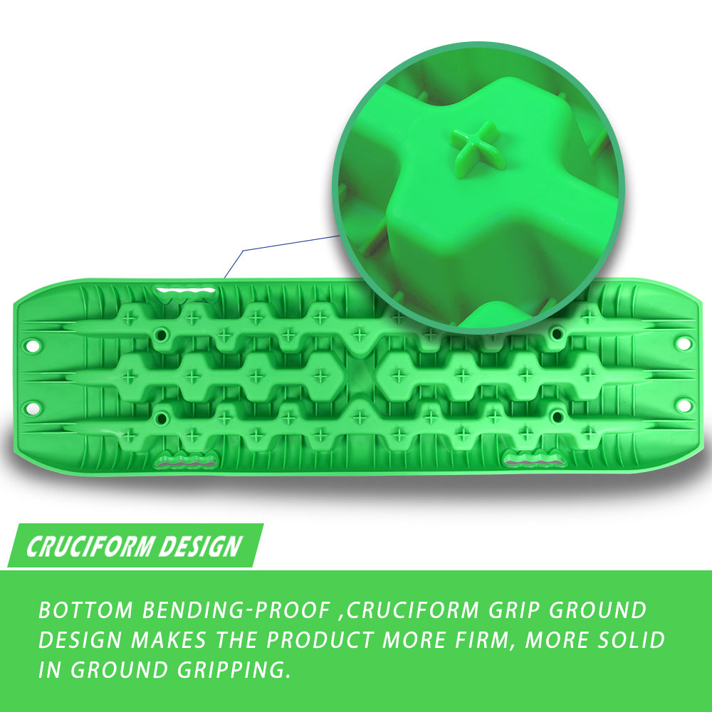 Sand/snow/mud grips on underside of track for non-slip applications can accommodate vehicles up to 10 tons.