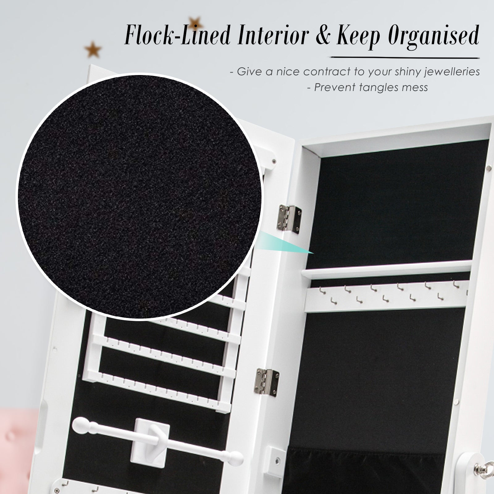 There are many earring hangers, necklace hooks, ring slots, and shelves to make it easier to separate and organise your precious jewelleries. You can certainly find many ways to arrange your accessories so you will be able to find a perfect way only for yourself! The black flock-lined interior will give your shiny jewelleries a nice contrast and under light, it will look even better!