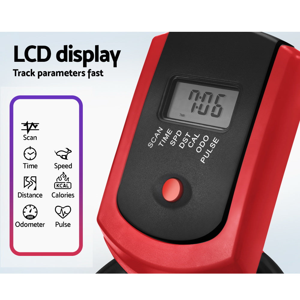 Tired of having to cancel your workout due to the weather, gym closures or other commitments? Now you?ll be able to exercise come rain or shine with an Everfit Spin Exercise Bike. Our gym-quality equipment fits perfectly in your home, helping you achieve your fitness goals one day at a time. With an industrial-strength powder-coated steel frame, heavy-duty stainless-steel flywheel and silent belt drive system, the bike offers a silent and smooth workout. Adjust the thick padded saddle seat, handlebars, and resistance levels to tailor your ideal workout. The onboard computer with an LCD monitor and built-in pulse sensor will track five fitness parameters on one display. Non-slip pedals with protective straps keep your feet firmly in place, while built-in wheels make the bike easy to move. Best of all, a in-built phone holder allows you to watch your favourite movies, shows or workout mixes as you exercise. So what are you waiting for? Start your very own home gym today with an Everfit Spin Exercise Bike.