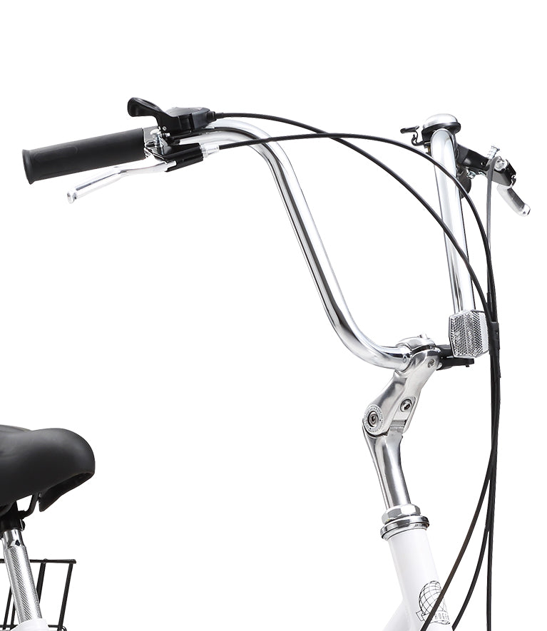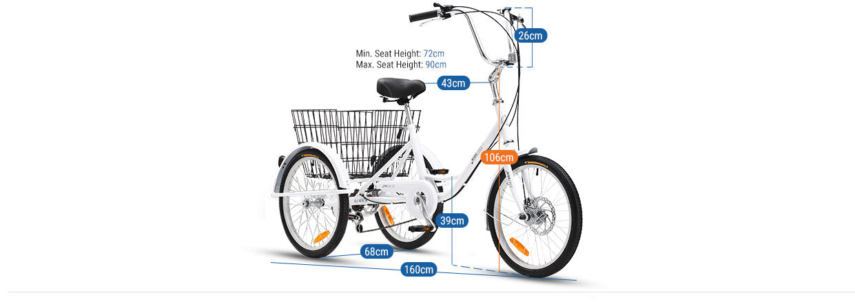 Technical Specifications Frame: Strong steel Frame with easy low stepover height, 20" Wheel Handlebars: Alloy adjustable stem with comfortable easy to reach handlebars Derailleur: Shimano 6 Speed rear derailleur and Shimano gear shifters Crankset: Alloy Crank with 36T Steel chainwheel Brakes: Front and rear sure stop disc brakes Saddle: Comfortable padded and spring leather saddle Wheels: Easy rolling 20" x 1.75" Tyres Special Features: Rear Basket Max User Weight*: 110kg User Height*: Approx. 130cm/150cm (Min/Max) Seat Height from Ground: Approx. 72cm/90cm (Min/Max) Warranty: Lifetime warranty on frame and fork