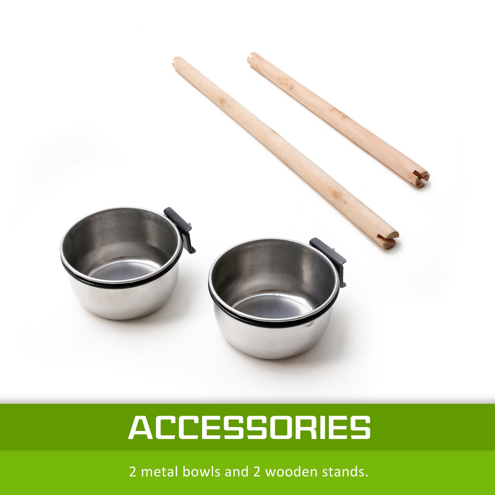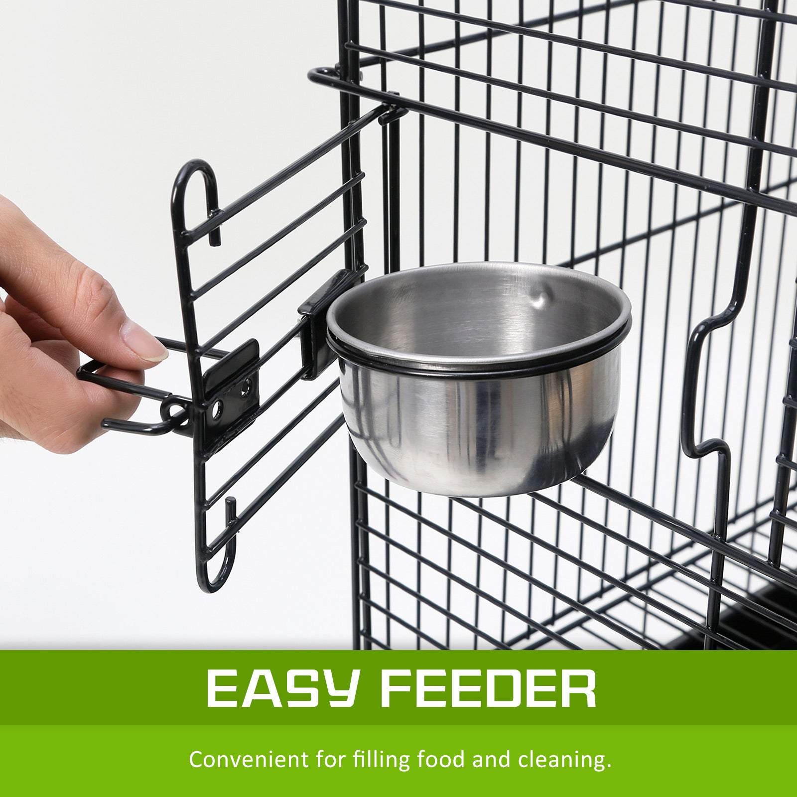 The cage's frame is made of durable and high-quality wrought iron and it is coated with black epoxy in order to prevent it from rusting and offer a longer service life. The top can be opened and closed. There is one large access door and 2 side access windows for stainless steel food/water containers so you can keep your bird safe and have easy access inside the cage and food/water. There is also a removable tray under in order to make cleaning easy. The four, 360 degree swivel caster plastic wheels makes relocating the birdcage very easy. It comes with 2 rest wooden perches.