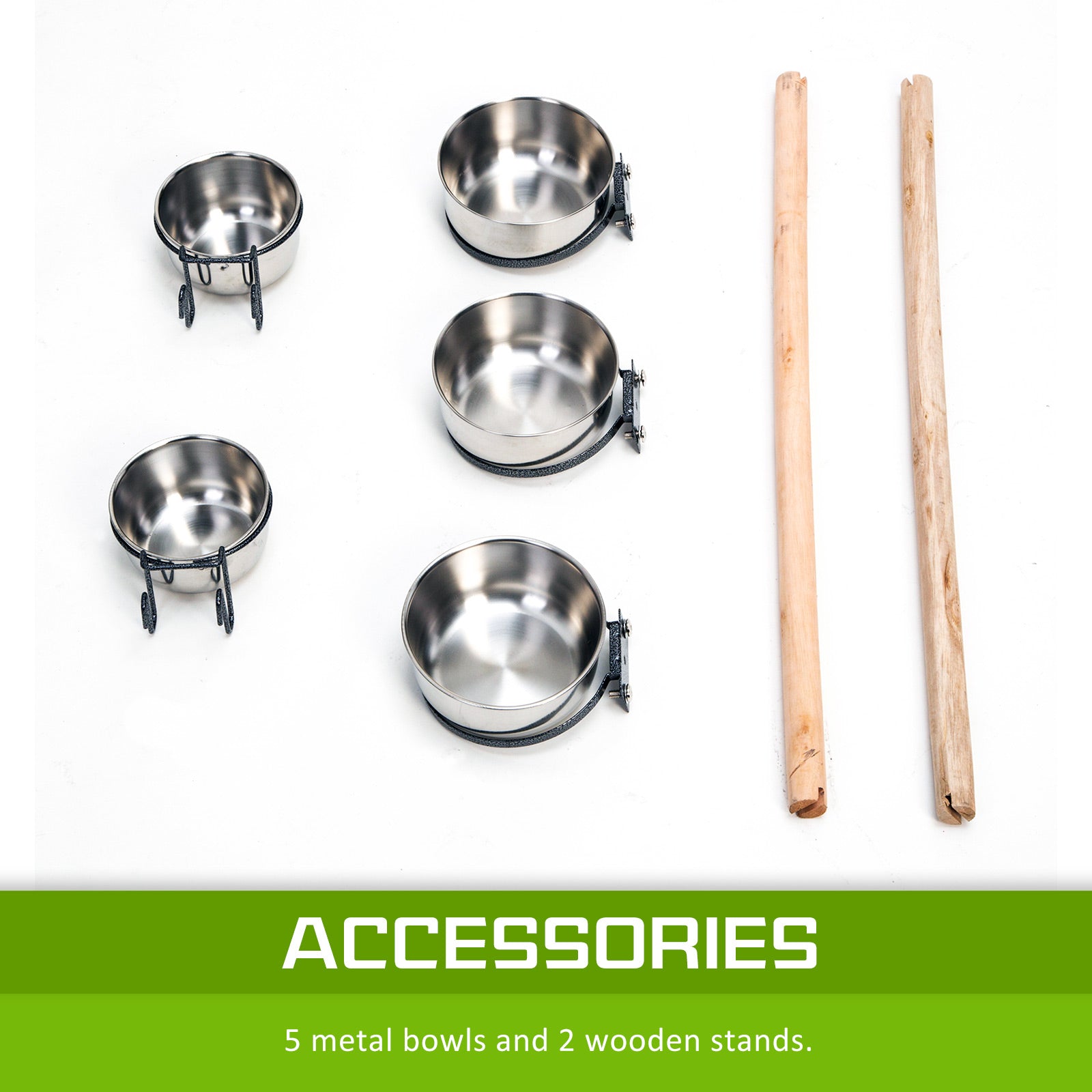 The cage's frame is made of durable and high-quality and heavy duty wrought iron and it is powder coated in order to prevent it from rusting and offer a longer service life. There is one large lockable main door on the front so you can keep your bird safe and have easy access inside the cage. There are also handy quick access doors for the food/water container so you do not need to open the main door to feed your bird. This is a great feature as you minimise the risk of them escaping. There is also a removable tray under in order to make cleaning easy. On the top of the cage, there is a display area where your bird can stand/feed and to make cleaning easier, it is fitted with a removable tray as well.There are four, 360 degree swivel caster plastic wheels so relocating the birdcage is very easy. 5 water/food container and 2 rest wooden perches are included. The cage also has a handy shelf under it so you can store your birds' needs, such as water, food and cleaning tools. Another good feature is that the cage has size waste catch surrounding the cage so when your bird is freely on the edge of the top part of the cage, droppings to the floor can be minimised.