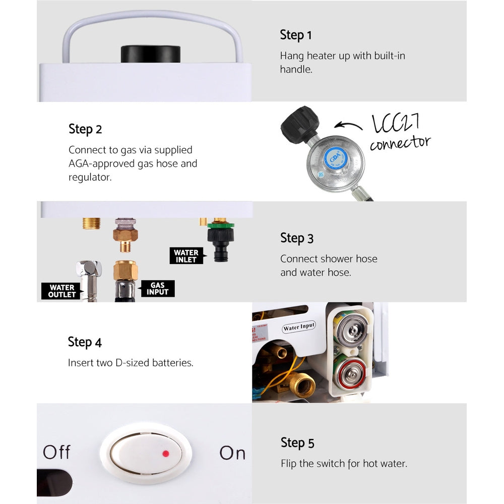 Lightweight and portable, the Gas Heater comes with a handy handle and all the required mounting brackets for a hassle-free set-up. Enjoy the open country. And enjoy your warm showers too with the Devanti Gas Water Heater. Order yours today.