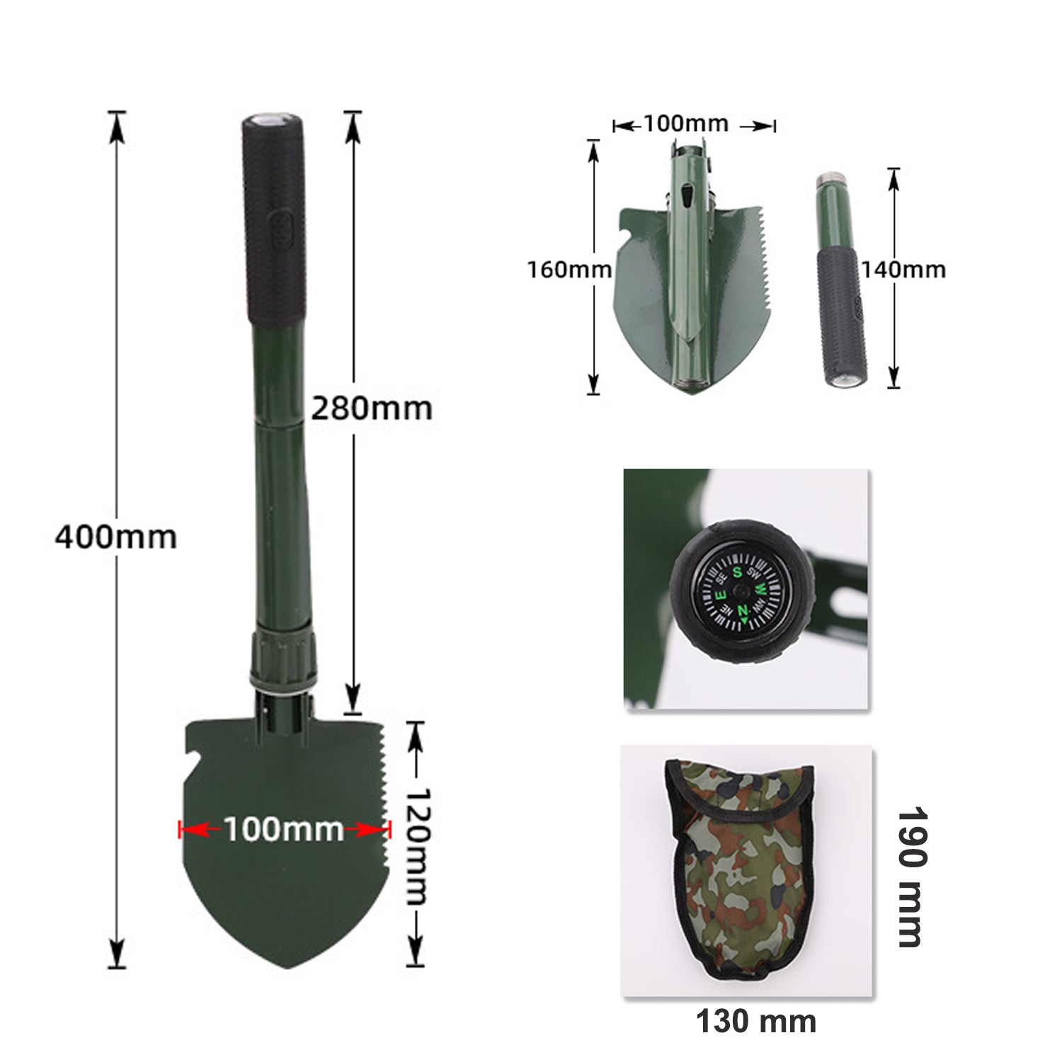 Made of strong tempered forged steel, the shovel measures 40 cm long when unfolded, include a serrated on one side of the blade so it can be used to saw off lightweight branches.