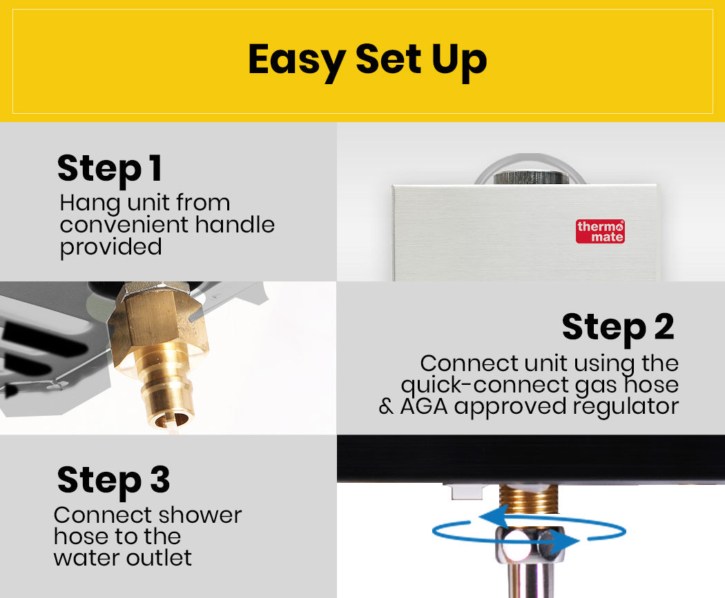 The Thermomate Tankless Outdoor Water Heater delivers endless hot water with optimal efficiency! No electricity is required, making this compact unit ideal for a hot shower when camping or caravaning, or for washing livestock or pets on a remote property.