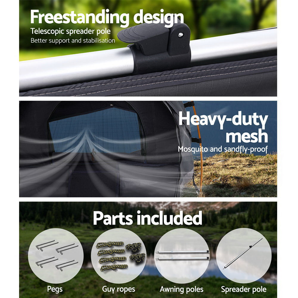 A 14oz 400gsm water-repellent Rip stop canvas cover, 500gsm PVC flooring and an extra 10cm high edge all round. Swagspeak for the ultimate tear-resistant waterproofing. Fully enclosed for privacy with zipped openings for fresh air anytime. Mesh panels to keep insects out. A 40mm high density foam mattress for better sleep on any surface. Thick aluminium support poles to hold up the entire set up.