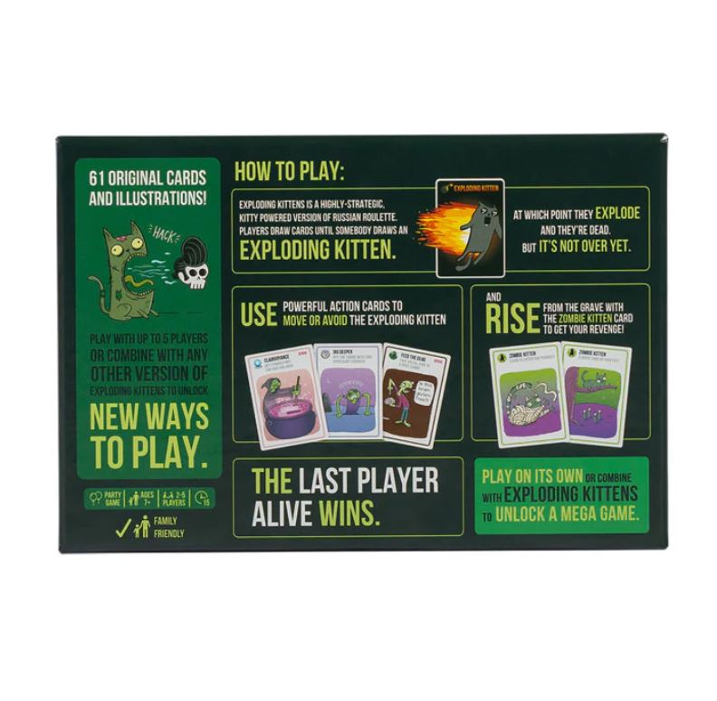 Zombie Kittens is still the highly strategic, kitty-powered version of Russian Roulette that you love, but it introduces a brand new deck of cards so that your game doesn’t end just because you blow up. Only living players can win the game, but dead players now get to keep the cards in their hands when they explode. They also get to play certain cards to torment the living players. And they can even come back from the dead to win the game. Zombie Kittens can be played by itself or can be combined with Exploding Kittens.