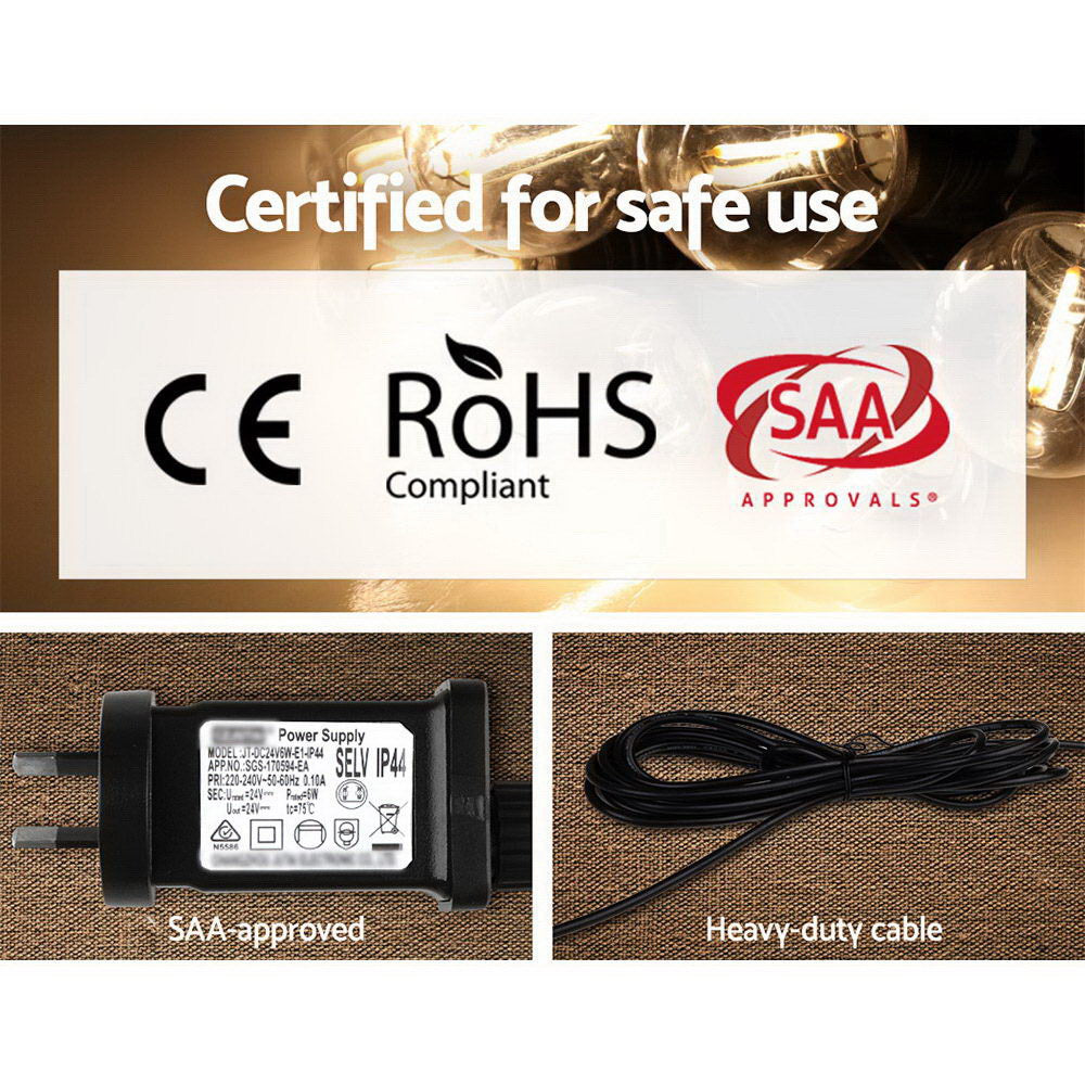 Our Jingle Jollys Festoon String Lights are great not only for wedding and birthday parties or special events, but also for creating a warm, inviting ambience with its bright and mellow glow. Suitable for both indoor and outdoor use, its IP44 rating means that it can be used in the rain and all weather conditions. Each bulb draws a very low voltage and is placed 90cm equally apart from each other throughout its 50m length for an even distribution of illumination and brightness. Not least, the each bulb has a 20,000 hours lifespan so that you can get to use the string lights for quite a while.