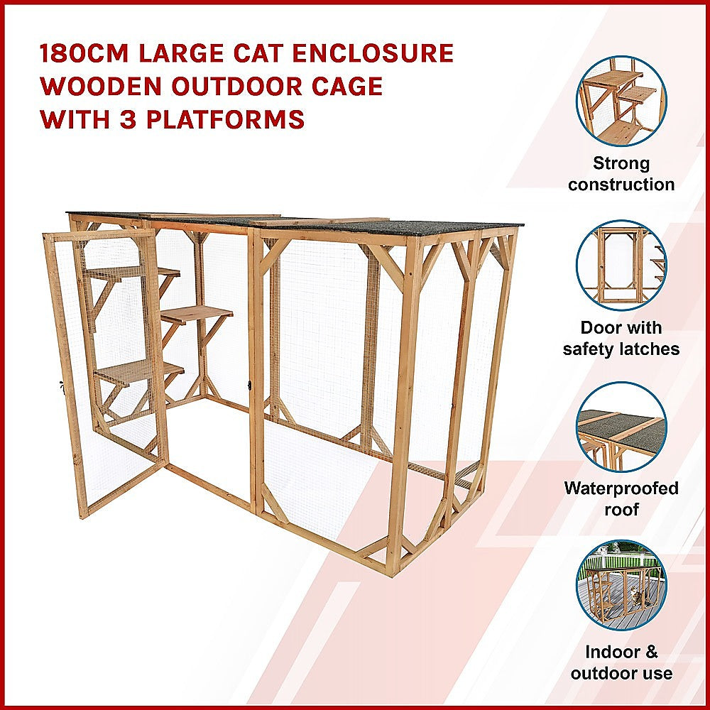 Have you ever wanted to allow your cats or small dogs to play outside but were afraid that they'd get out into traffic or fall victim to predators? With this completely enclosed playpen, you never have to worry about their safety. They'll enjoy the fresh air, sunshine, sights, and sounds of nature without the dangers of outdoor life. Crafted from natural fir timber and wrapped in metal wire, this sturdy patio-like enclosure will keep your pets safely inside. Three platforms provide the perfect perch for Kitty to relax and watch the world go by. Overhead, an asphalt-covered roof protects your pets from rain and the hot summer sun.