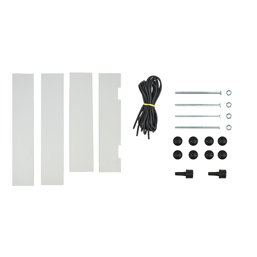 Contents: 2 strings, 4 baffles, 4 screws and caps, 1 large two-way locking pet door and panel