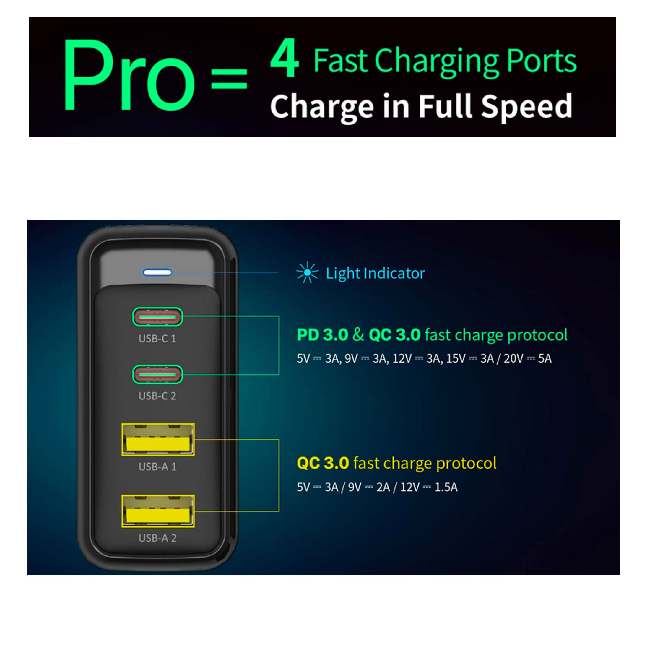 Both USB-C ports comply with both Power Delivery (PD 3.0) and Quick Charge (QC 3.0) fast charge protocols:5V ? 3A, 9V ? 3A, 12V ? 3A, 15V ? 3A, 20V ? 5A, while both USB-A ports comply with QC3.0 fast charge protocol: 5V ? 3A, 9V ? 2A, 12V ? 1.5A.