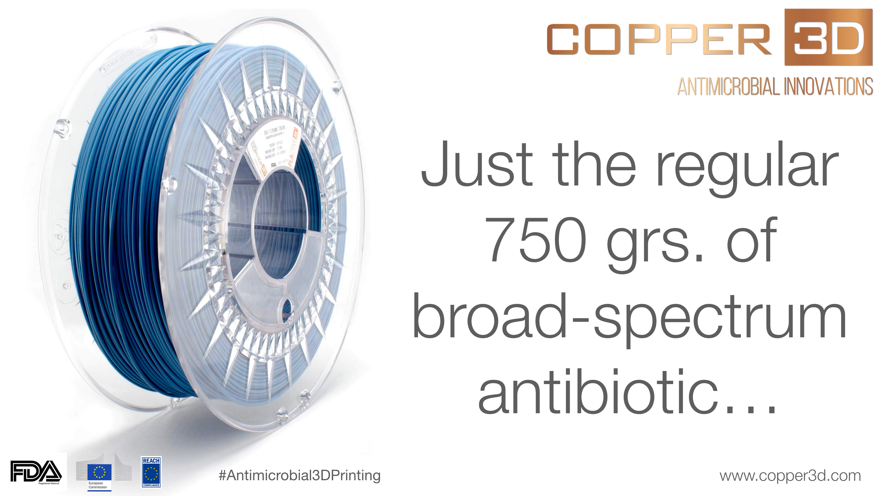 Copper 3D PLActive is an innovative Nanocomposite 3D printer filament developed with proven high-quality EasyFil PLA compound and a patented, scientifically validated and highly effective Nano-Copper additive. PLActive filament is FDA registered and eliminates more than 99.99% of fungi, viruses, bacteria and a wide range of microorganisms.