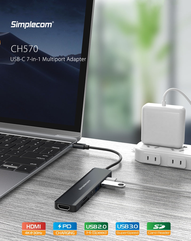 CH570 is a 7-in-1 USB-C multiport adapter for modern laptops with multifunctional USB-C interface, you can get the most out of your laptop through USB-C port. It turns a single USB-C port into 7 ports, including 2x USB-A ports, 2x slots card reader, HDMI Display expansion, 1x USB-C date port and 1x USB-C PD charging port.