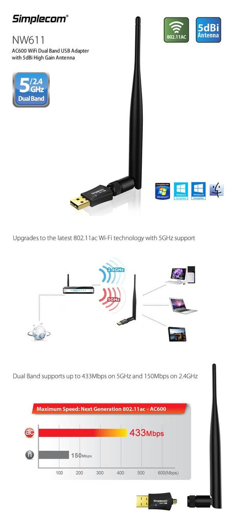 Simplecom NW611 Dual Band Wireless USB Adapter connects a Windows or Mac computer to next generation 802.11ac wireless. AC600 802.11ac wireless provides connectivity for the 2.4GHz band at speeds of 150Mbps or 5GHz band at speeds of 433Mbps. 5dBi adjustable High Gain antennas provide high performance and long distance connections for your wireless network, offering a better performance on online gaming, HD video streaming, and VoIP phone. It ensures a strong and stable wireless connection and allows you to enjoy the wireless freedom around your home.