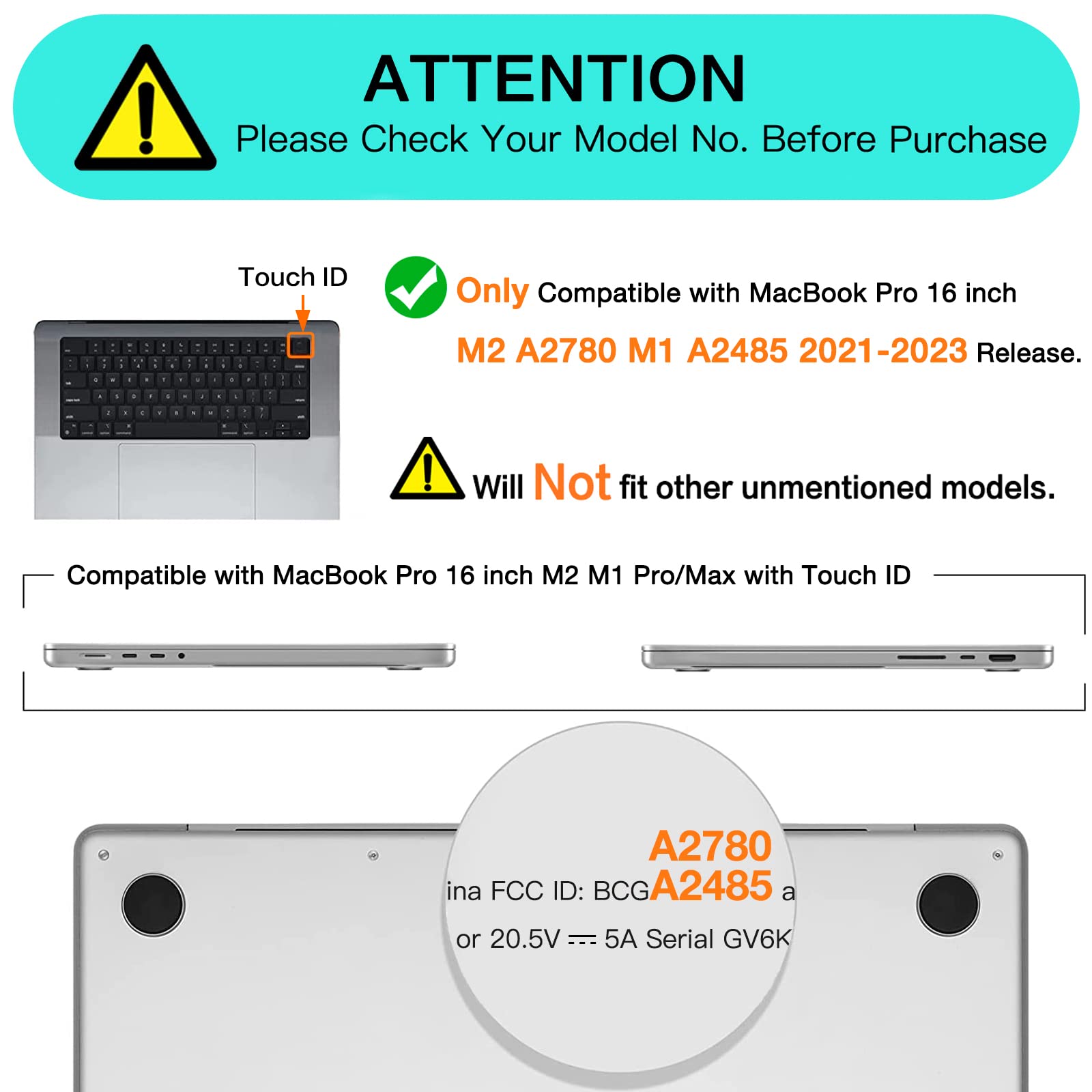 Please note that this case is not compatible with all models of 13" MacBook Pro, 15" MacBook Pro, or 14" MacBook Pro. Please kindly ask you to check the model number located at the bottom of your laptop to ensure compatibility.