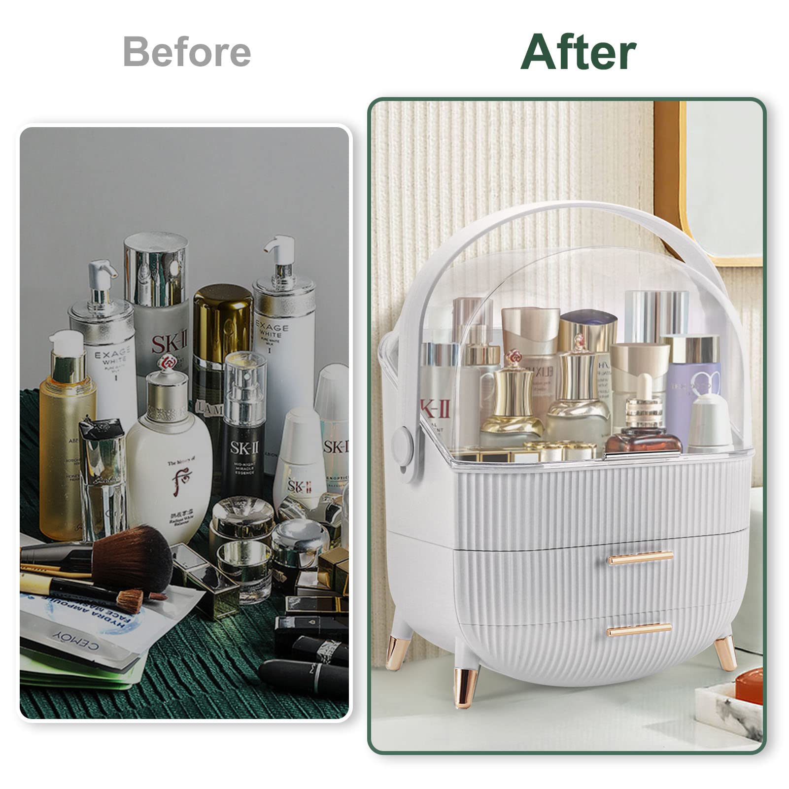Skincare organizers have a high-quality environmentally friendly ABS material, strong and durable, Portable handle design, easy to carry and move, can be placed in the bathroom, bedroom or dressing room vanity. Also suitable for car travel.