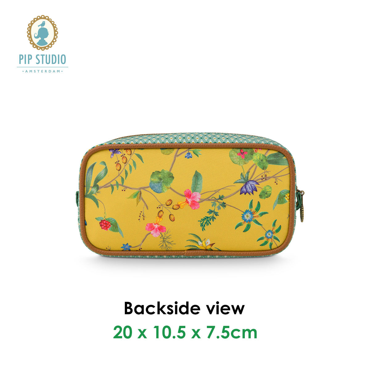 This beautiful Petites Fleurs Yellow Small Square Cosmetic Bag by PIP Studio is made of water-repellent satin that is trimmed with faux leather piping. The beautiful Petites Fleurs print of this cosmetic bag consists of elegant flowers. You will find multiple different colours of flowers printed in black, blue, brown, green, red, olive, gold, and yellow colour tones on a yellow background. The bag is finished off with the Pip logo in the middle.