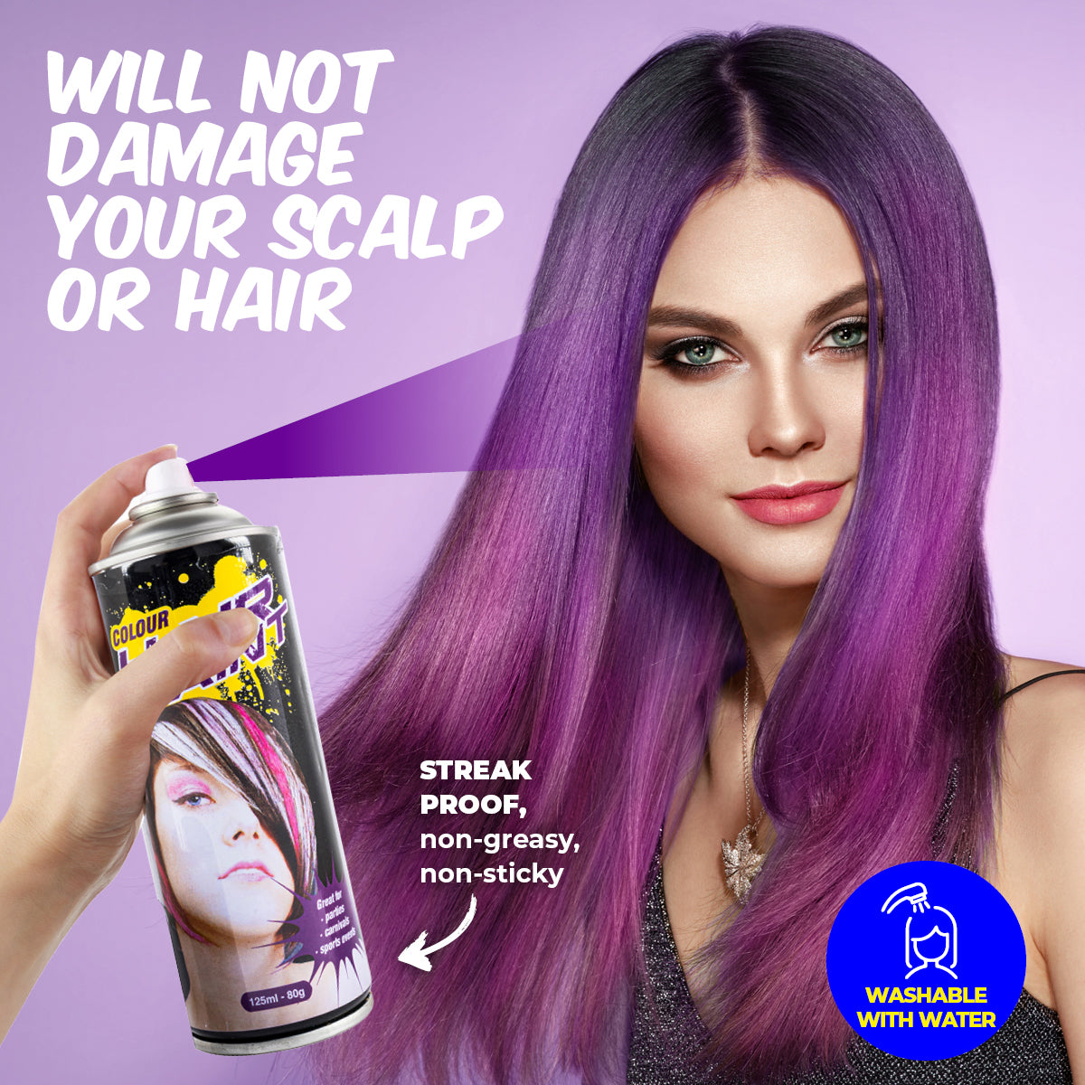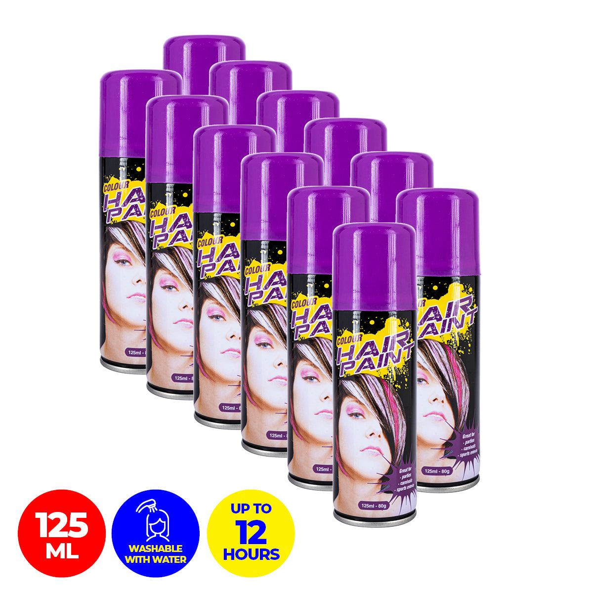 Party Central 12PCE Hair Spray Purple Long Lasting Non-Sticky 125ml