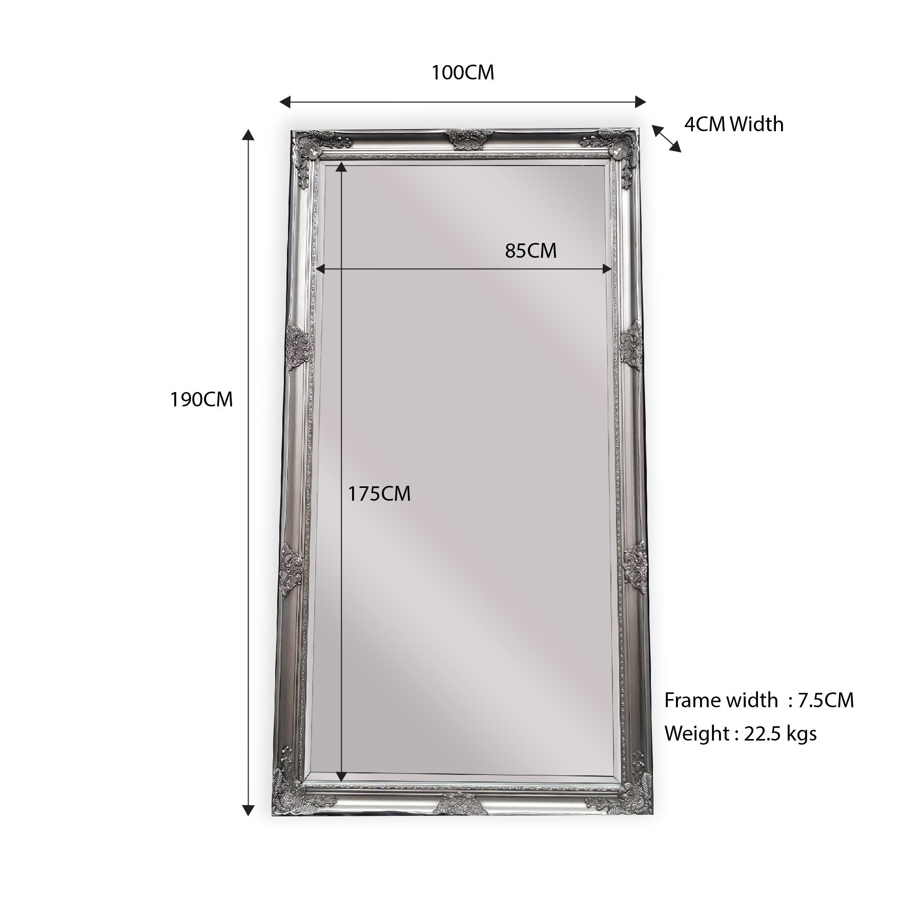 The French Provincial Ornate Mirror in Antique Silver - X-Large measuring 100cm x 190cm is a stunning addition to any home decor. It features an intricate and ornate design with an antique silver finish that creates a beautiful and elegant look. The rectangular shape and size make it a perfect statement piece for any room in your home. The mirror is made from high-quality materials, including wood and mirror, and can be hung with the included attachments at the back of the mirror.