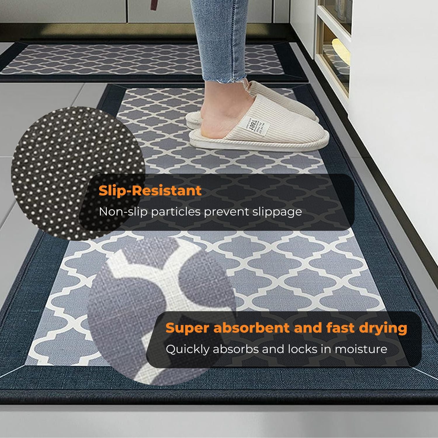 Experience superior moisture absorption and quick drying with the GOMINIMO 2 PCS Washable Non-Slip Kitchen Floor Mat. Its super absorbent properties ensure efficient liquid capture, while the fast-drying feature keeps your kitchen floor dry and safe.