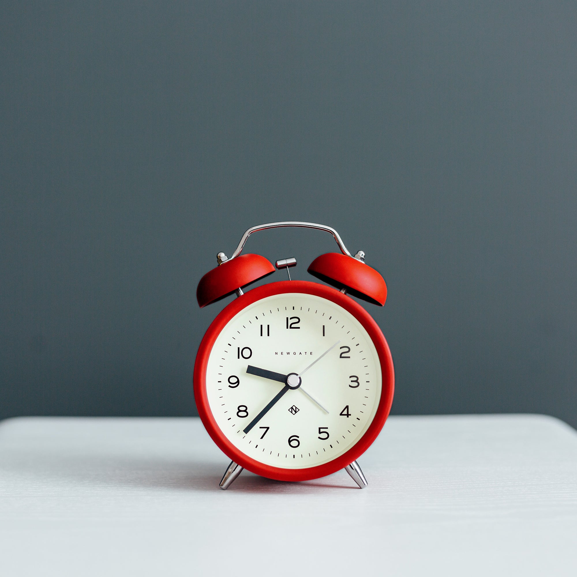 Newgate Charlie Bell Echo Matte Fire Engine Red A bright red alarm clock with a colourful modern matt-finish case, contemporary graphic dial and a moving hammer and twin-bell alarm.