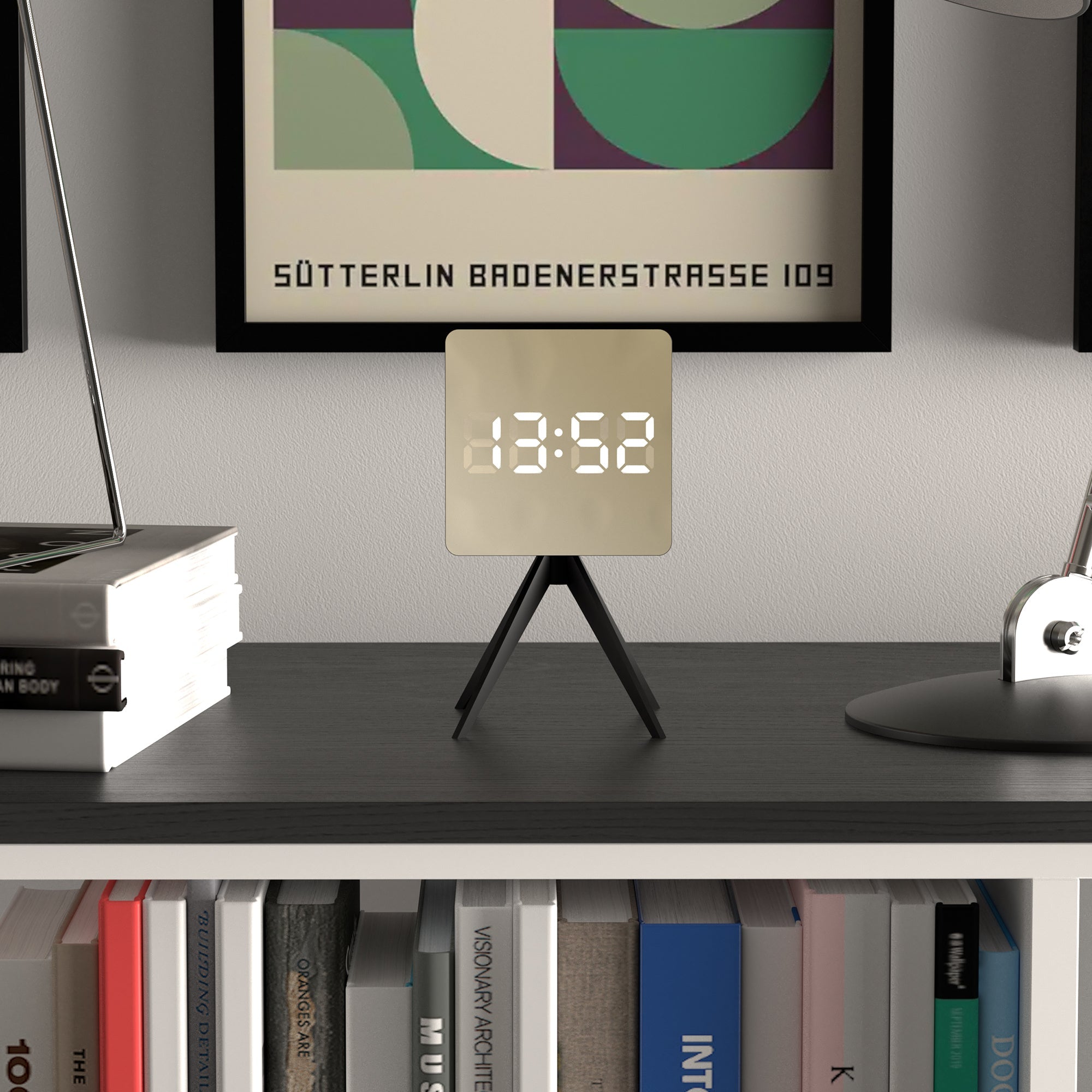 A squared case with a gold mirror effect LED screen is held upright by angled tetrapod legs coated in matt black silicone.