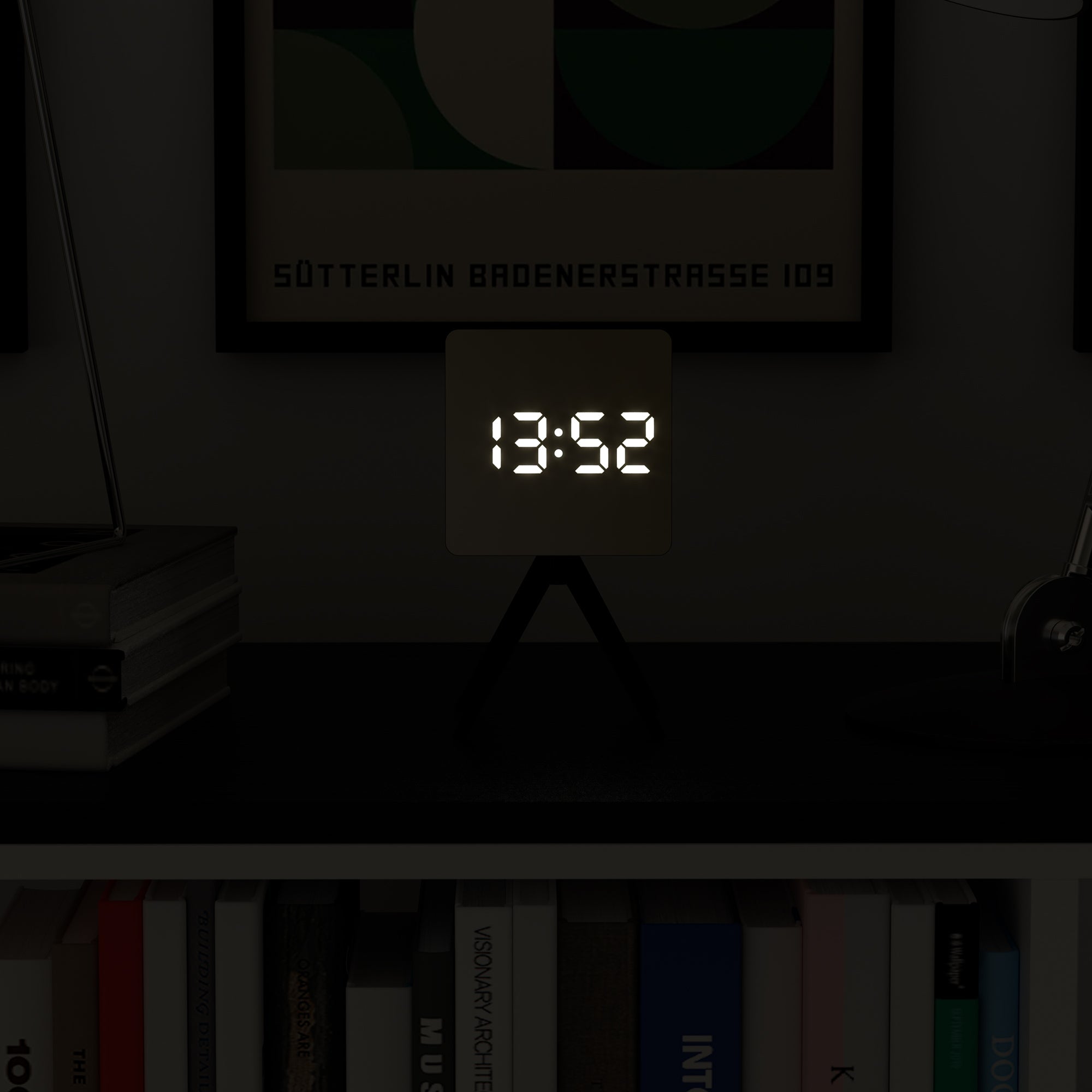 The unusual design incorporates a 12 or 24-hour time display, a digital beep alarm, a snooze function, night mode and brightness adjustment, and an optional temperature display.