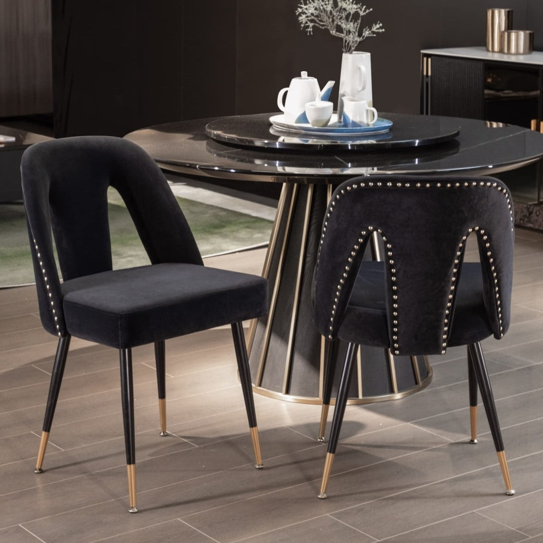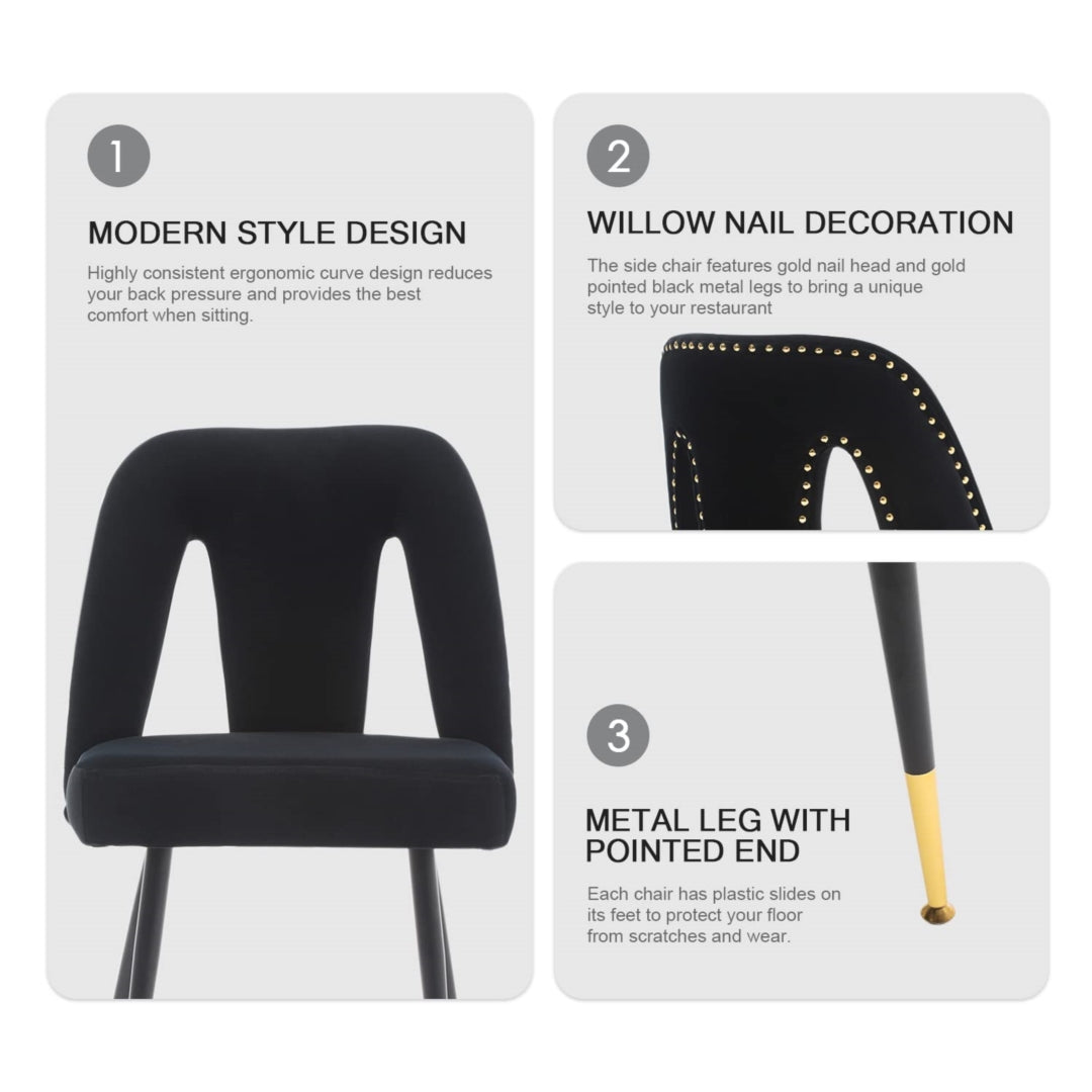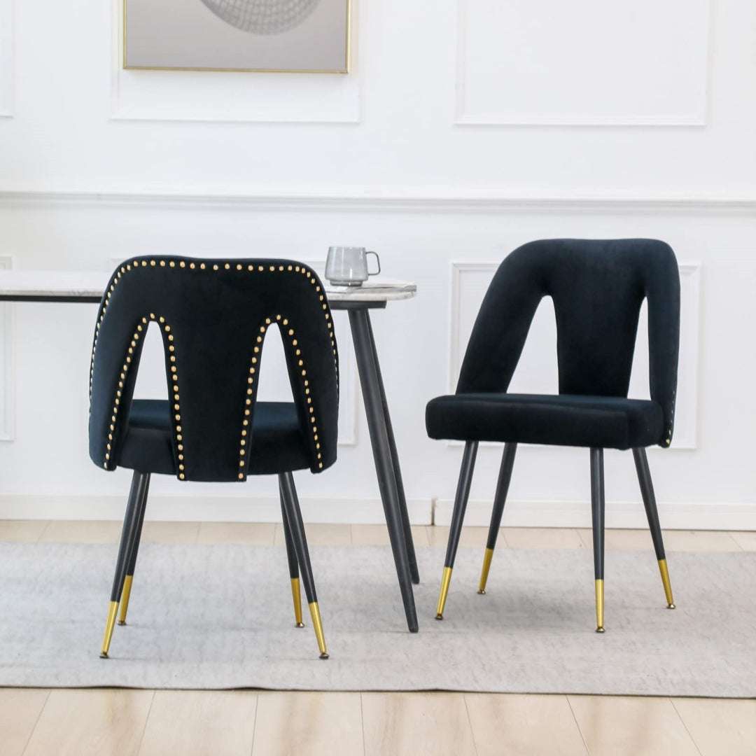 Our side chairs feature gold studs and gold-tipped black metal legs, bringing chic, modern style to your dining room in a cinch. Each chair has plastic glides on the feet to protect your floors from scratches and scuffs.
