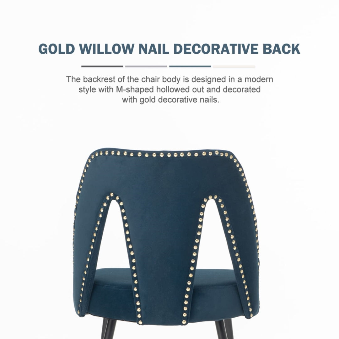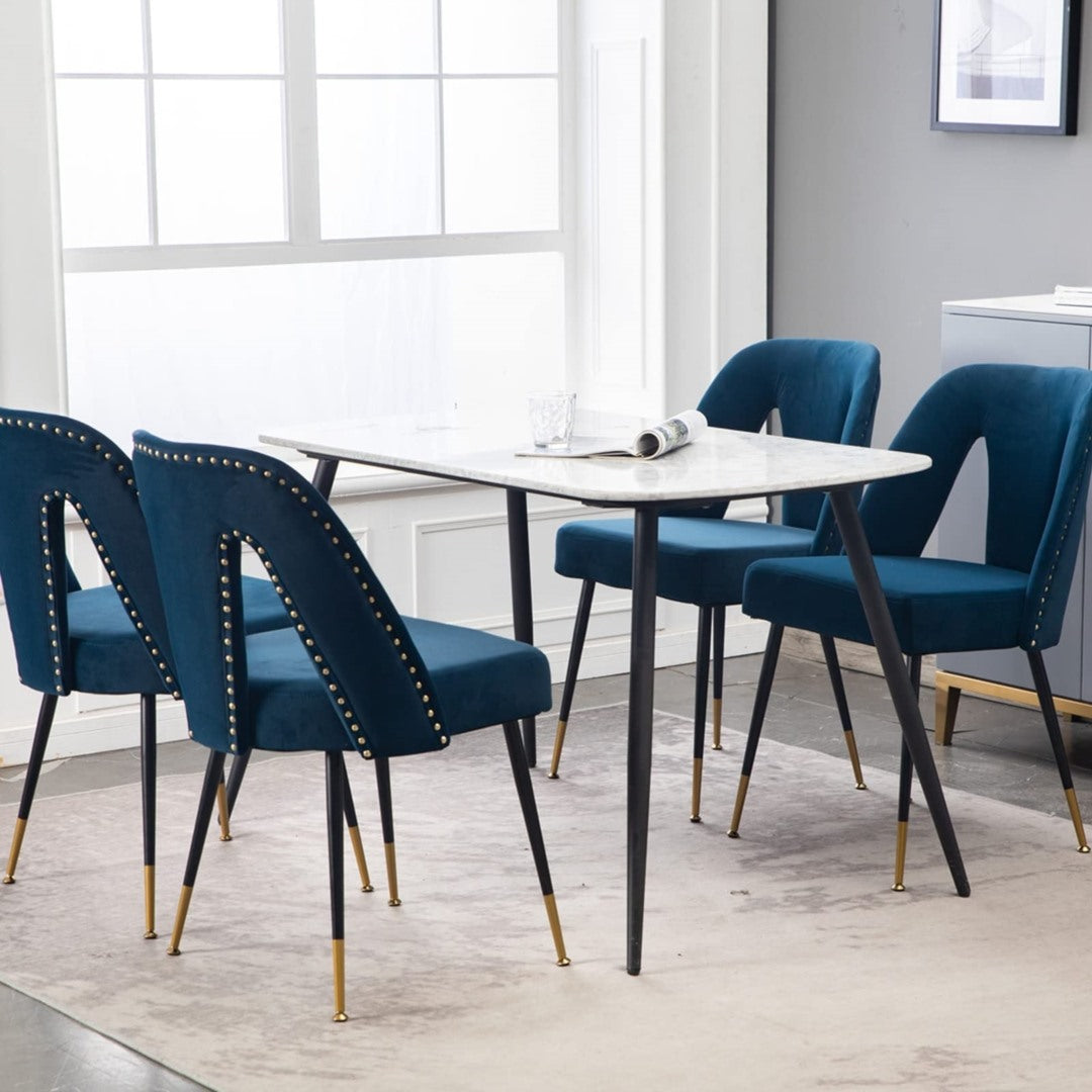 Our side chairs feature gold studs and gold-tipped black metal legs, bringing chic, modern style to your dining room in a cinch. Each chair has plastic glides on the feet to protect your floors from scratches and scuffs.