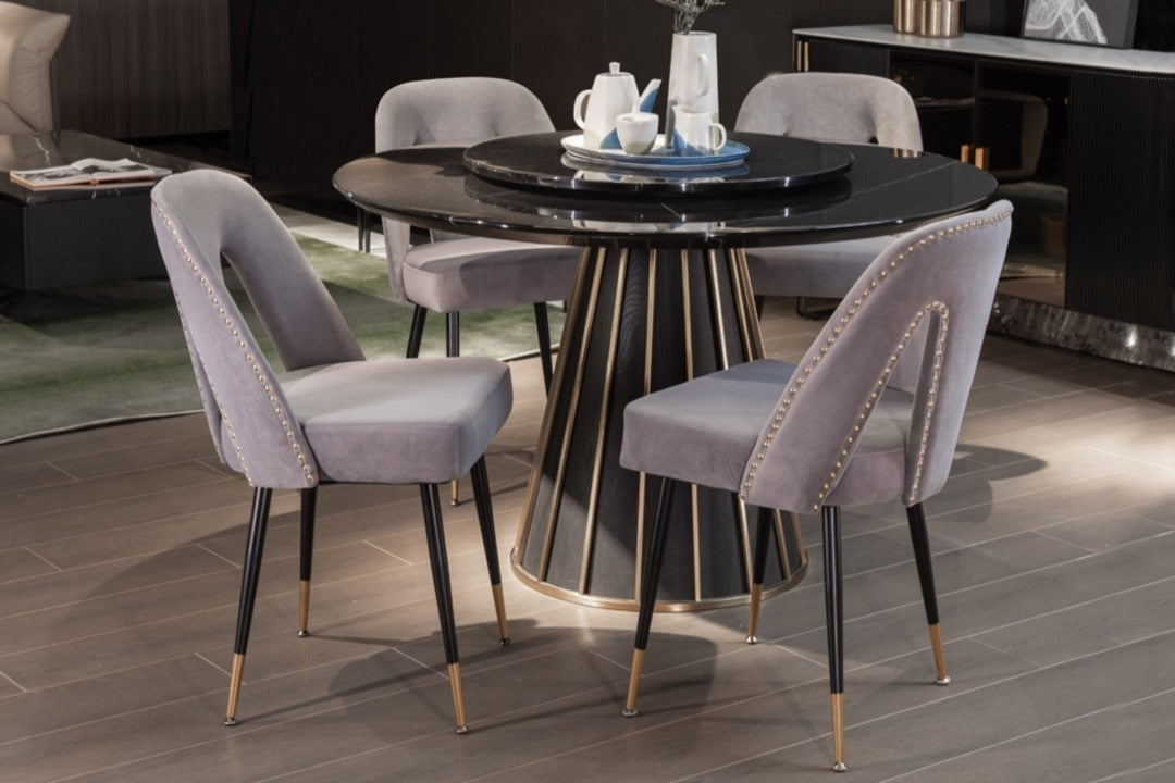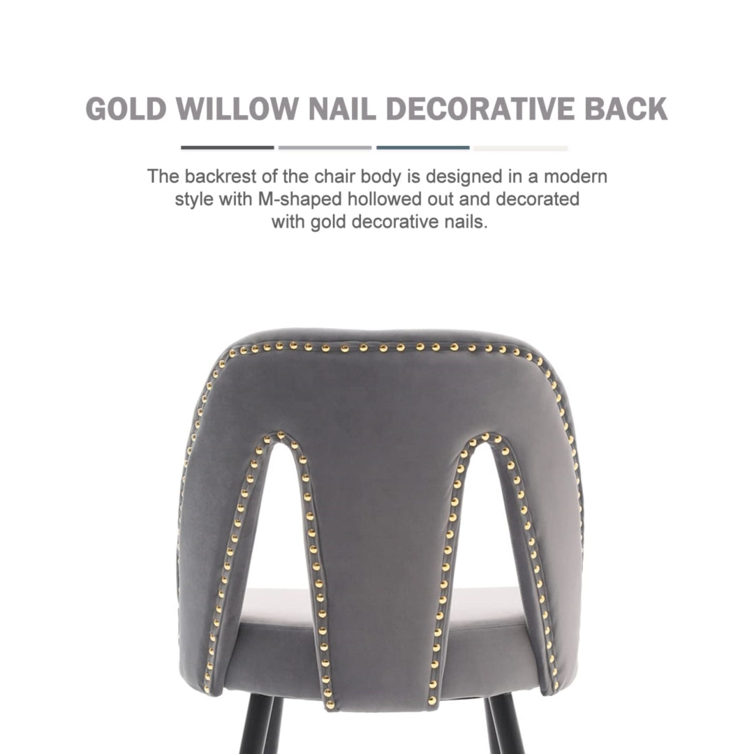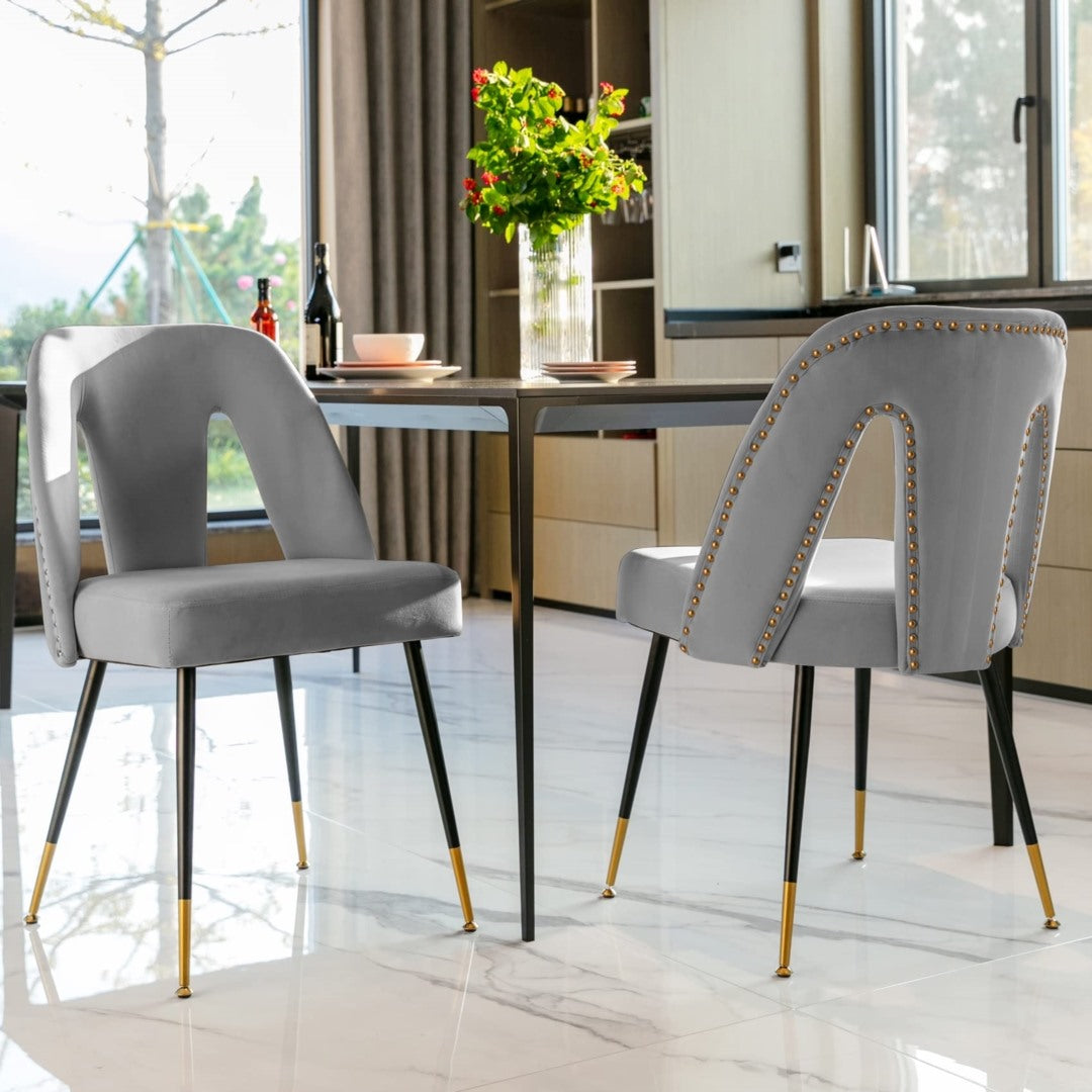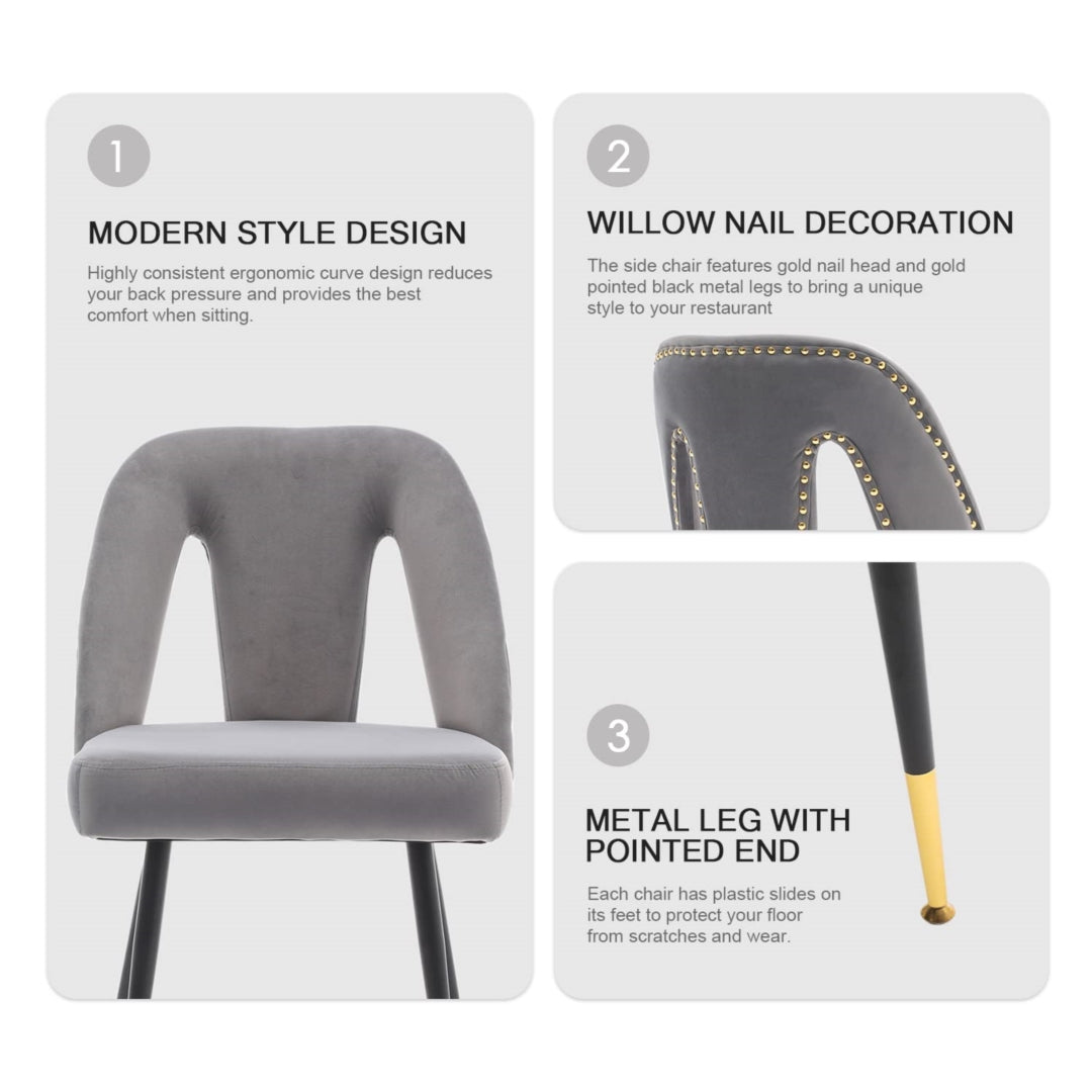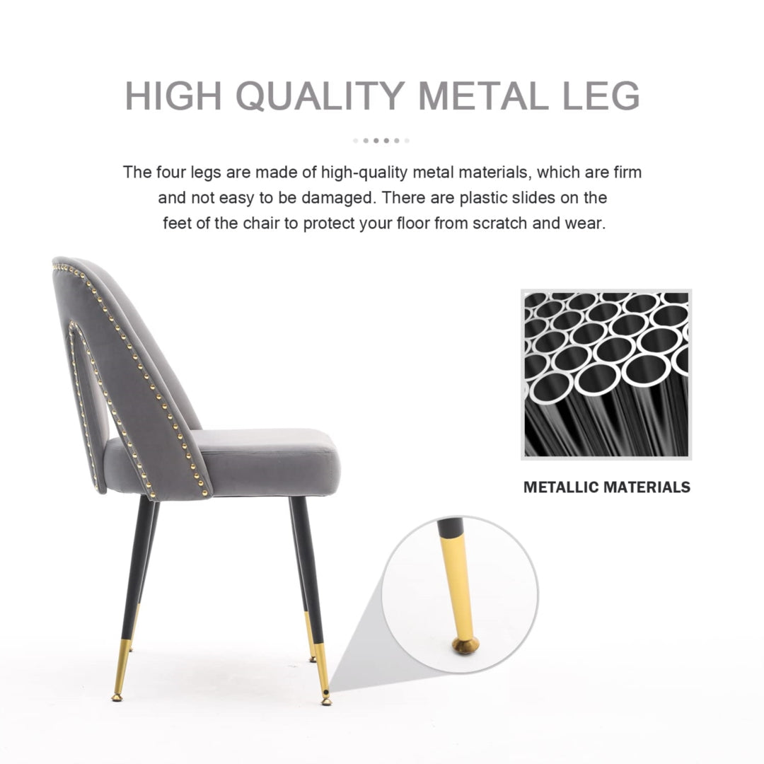 Our side chairs feature gold studs and gold-tipped black metal legs, bringing chic, modern style to your dining room in a cinch. Each chair has plastic glides on the feet to protect your floors from scratches and scuffs.