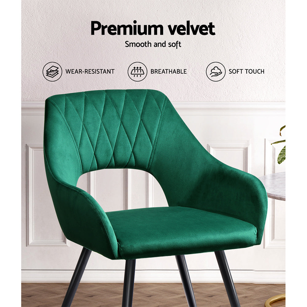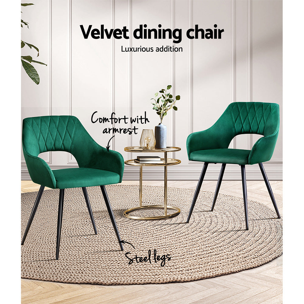 Wine, dine, and entertain guests with our meticulously designed Artiss dining chairs. They make a luxurious addition to any dining space and will make your guests envious of your gorgeous dining ambience. Not just for your dining room, these dining chairs are sure to make a statement in your study room, living room, and dressing room. Their versatility and ultra-modern design make them stand out. Incredibly stylish and sophisticated, our Artiss dining chairs feature inner solid wood construction with plush velvet upholstery that ensures lasting quality. It comes with solid steel legs with an anti-slip feet pad for ultimate stability and keeping your floors scratch-free. The dining chairs flaunt plush seats made with high-resilience foam that offer incredible comfort and support, and the cushioned back support with comfortable armrests allow you to dine with great comfort. Our dining chairs can hold up to 150kg weight, and their reinforced steel fixings make them super stable and reliable. Our Artiss dining chairs are certainly a big bang for your buck. Bring home this luxurious set of dining chairs without any hesitation. This product comes with one year warranty.